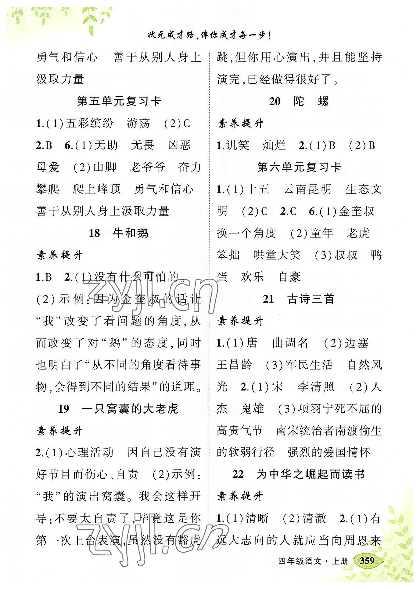 注:目前有些书本章节名称可能整理的还不是很完善,但都是按照顺序排列的,请同学们按照顺序仔细查找。练习册 2022年黄冈状元成才路状元大课堂四年级语文上册人教版湖南专版 答案主要是用来给同学们做完题方便对答案用的,请勿直接抄袭。