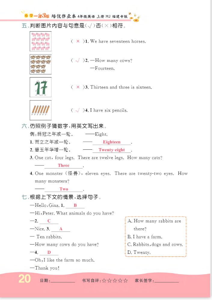 注:目前有些书本章节名称可能整理的还不是很完善,但都是按照顺序排列的,请同学们按照顺序仔细查找。练习册 2022年一课3练培优作业本四年级英语上册闽教版福建专版 答案主要是用来给同学们做完题方便对答案用的,请勿直接抄袭。