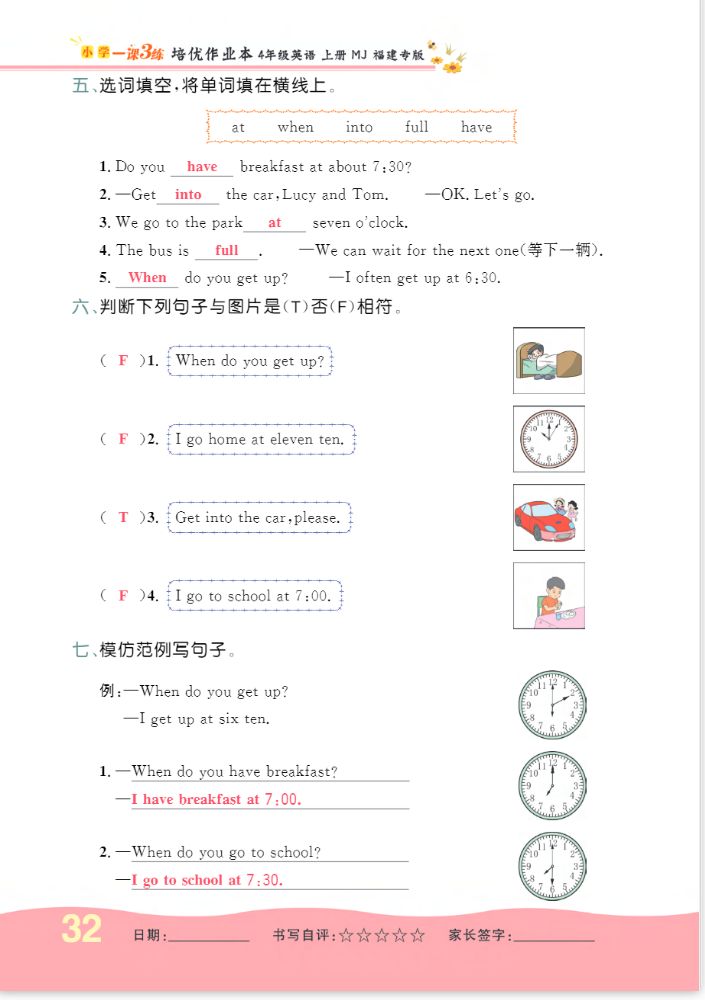 2022年一课3练培优作业本四年级英语上册闽教版福建专版