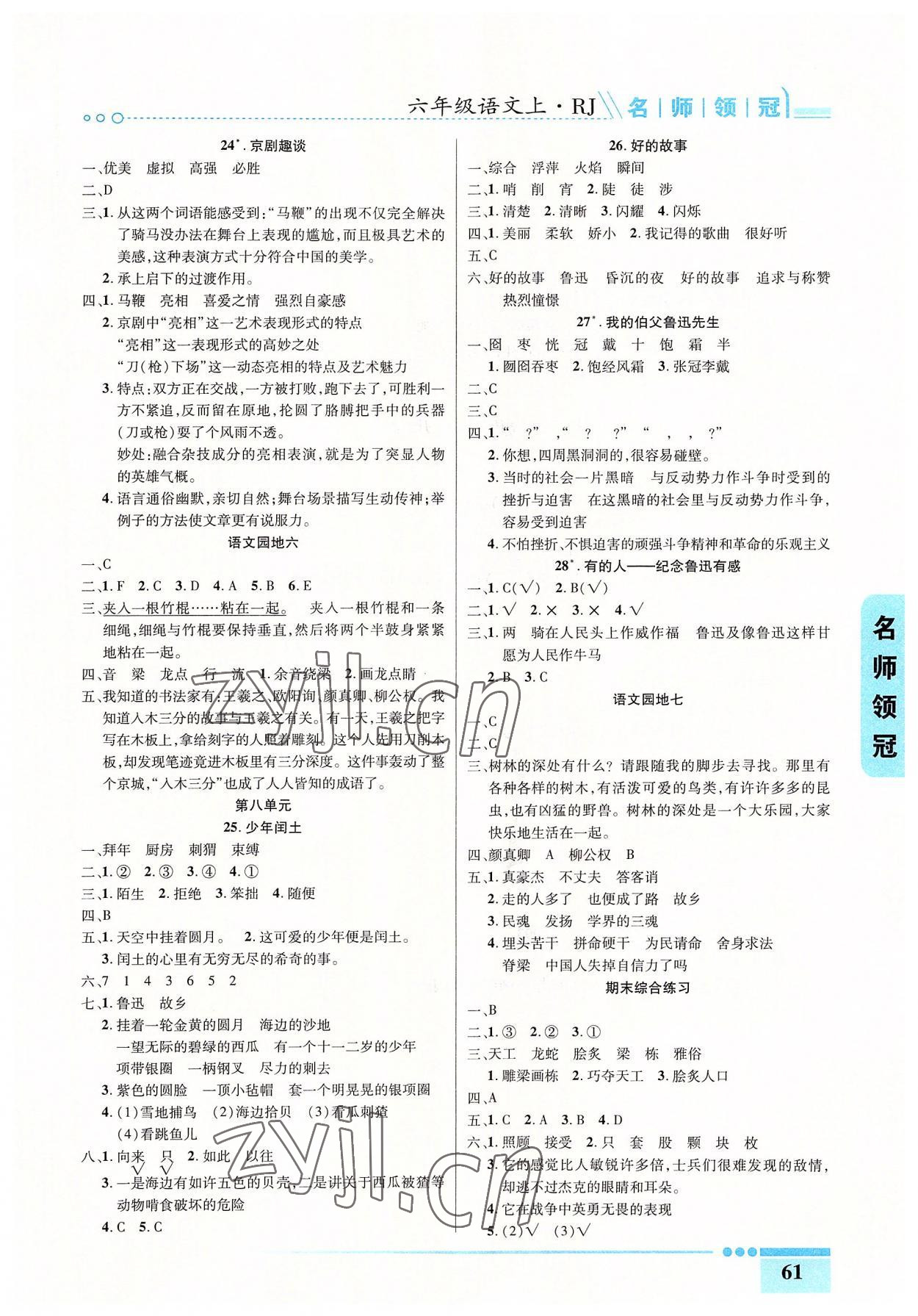 注:目前有些书本章节名称可能整理的还不是很完善,但都是按照顺序排列的,请同学们按照顺序仔细查找。练习册 2022年名师领冠课时通关六年级语文上册人教版 答案主要是用来给同学们做完题方便对答案用的,请勿直接抄袭。