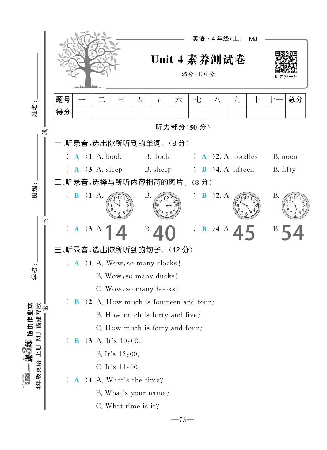 2022年一课3练培优作业本四年级英语上册闽教版福建专版