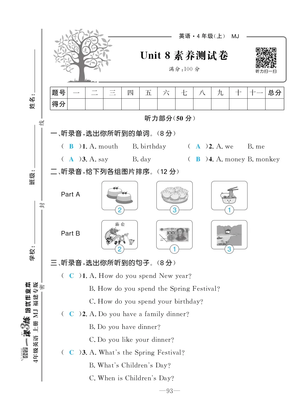 2022年一课3练培优作业本四年级英语上册闽教版福建专版