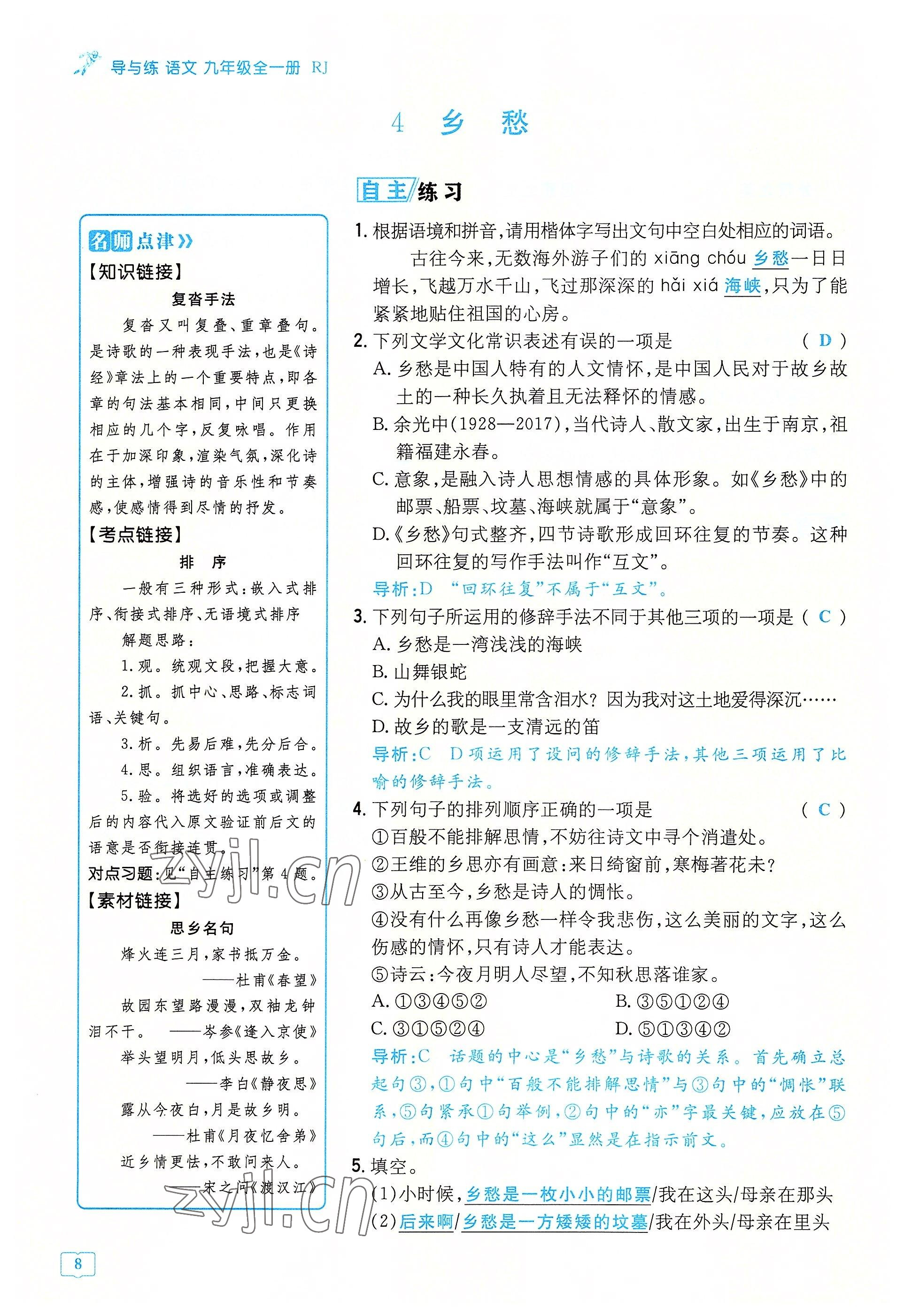 注:目前有些书本章节名称可能整理的还不是很完善,但都是按照顺序排列的,请同学们按照顺序仔细查找。练习册 2022年导与练九年级语文全一册人教版贵阳专版 答案主要是用来给同学们做完题方便对答案用的,请勿直接抄袭。