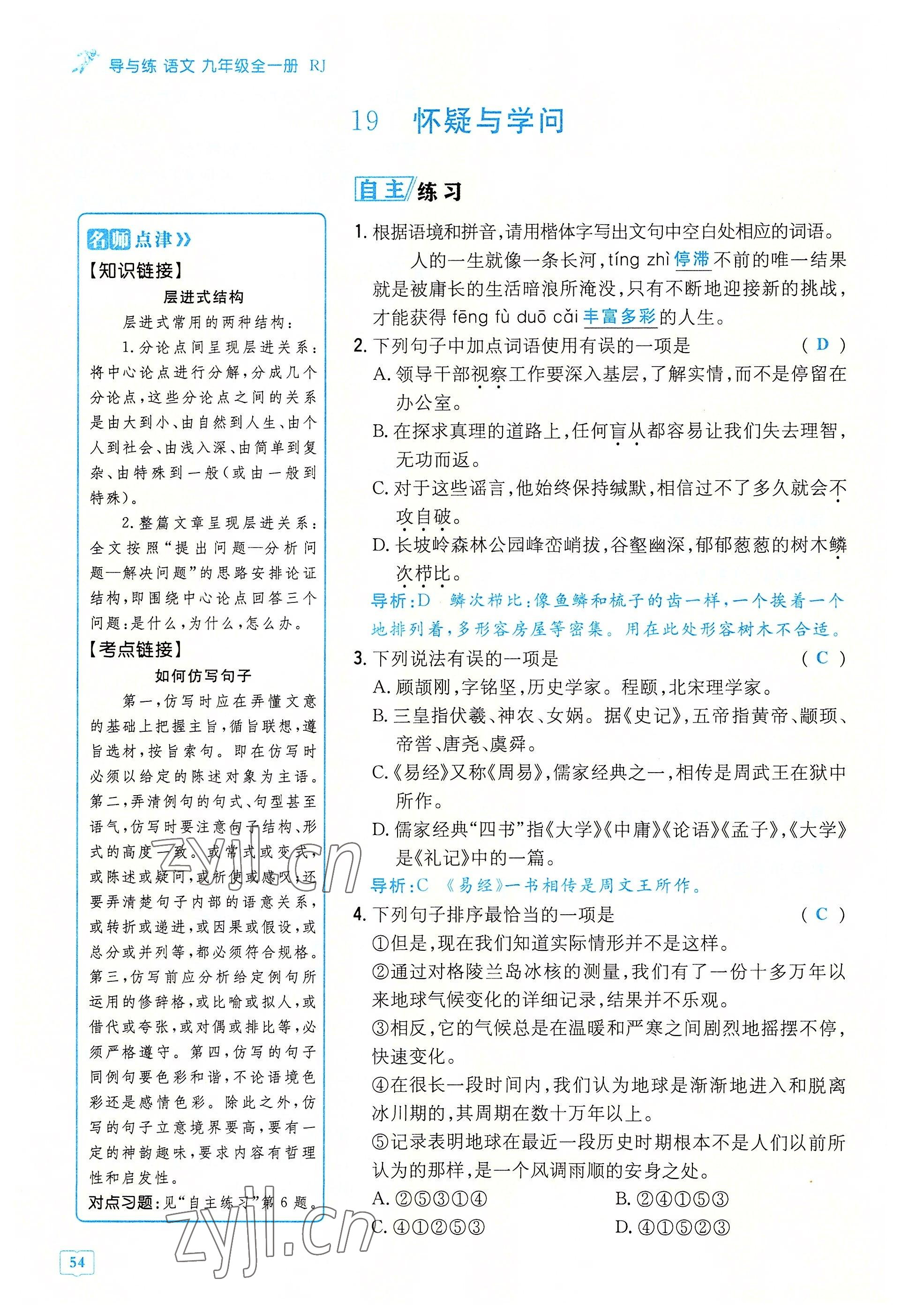 注:目前有些书本章节名称可能整理的还不是很完善,但都是按照顺序排列的,请同学们按照顺序仔细查找。练习册 2022年导与练九年级语文全一册人教版贵阳专版 答案主要是用来给同学们做完题方便对答案用的,请勿直接抄袭。