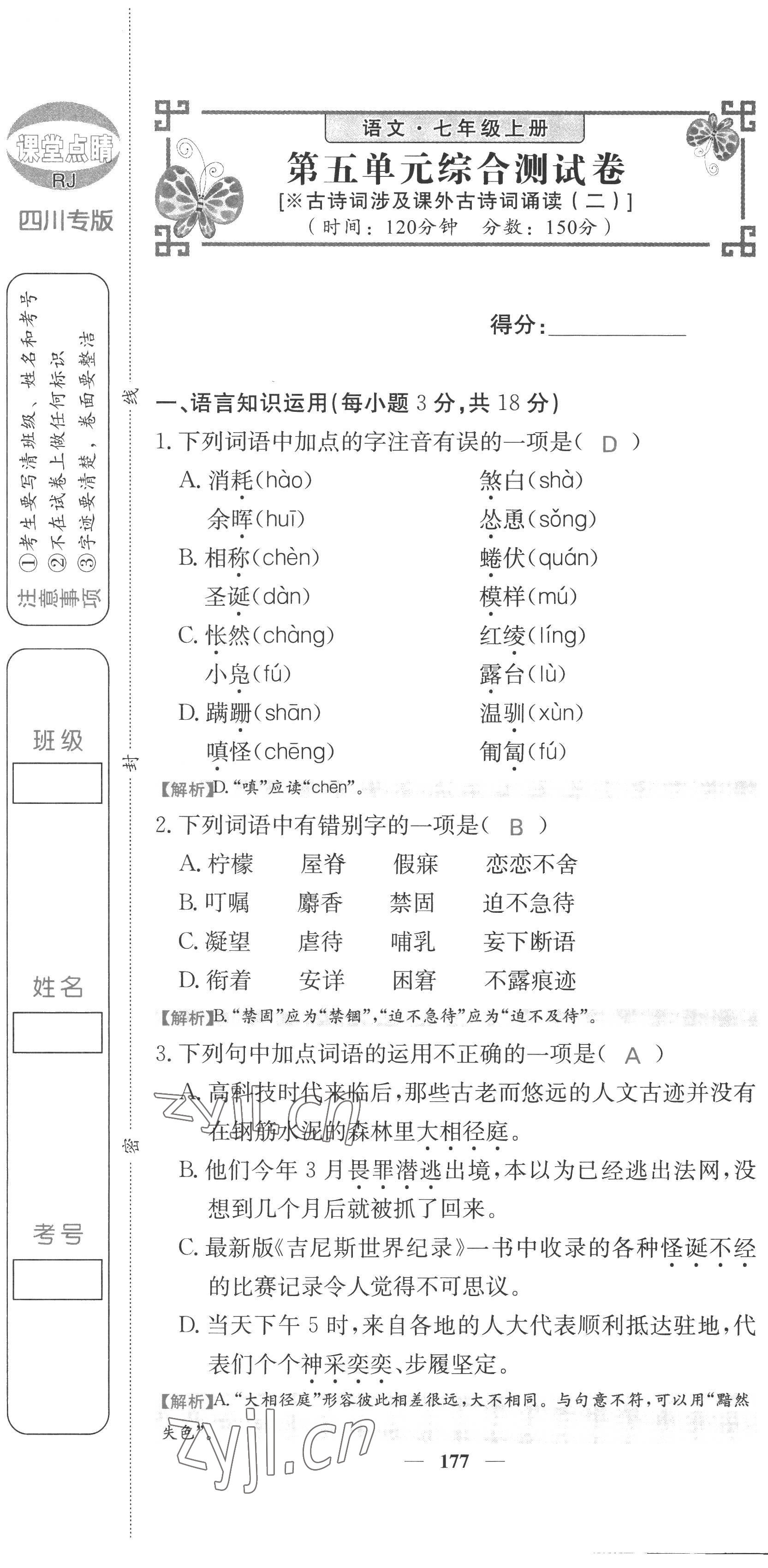注:目前有些书本章节名称可能整理的还不是很完善,但都是按照顺序排列的,请同学们按照顺序仔细查找。练习册 2022年课堂点睛七年级语文上册人教版四川专版 答案主要是用来给同学们做完题方便对答案用的,请勿直接抄袭。