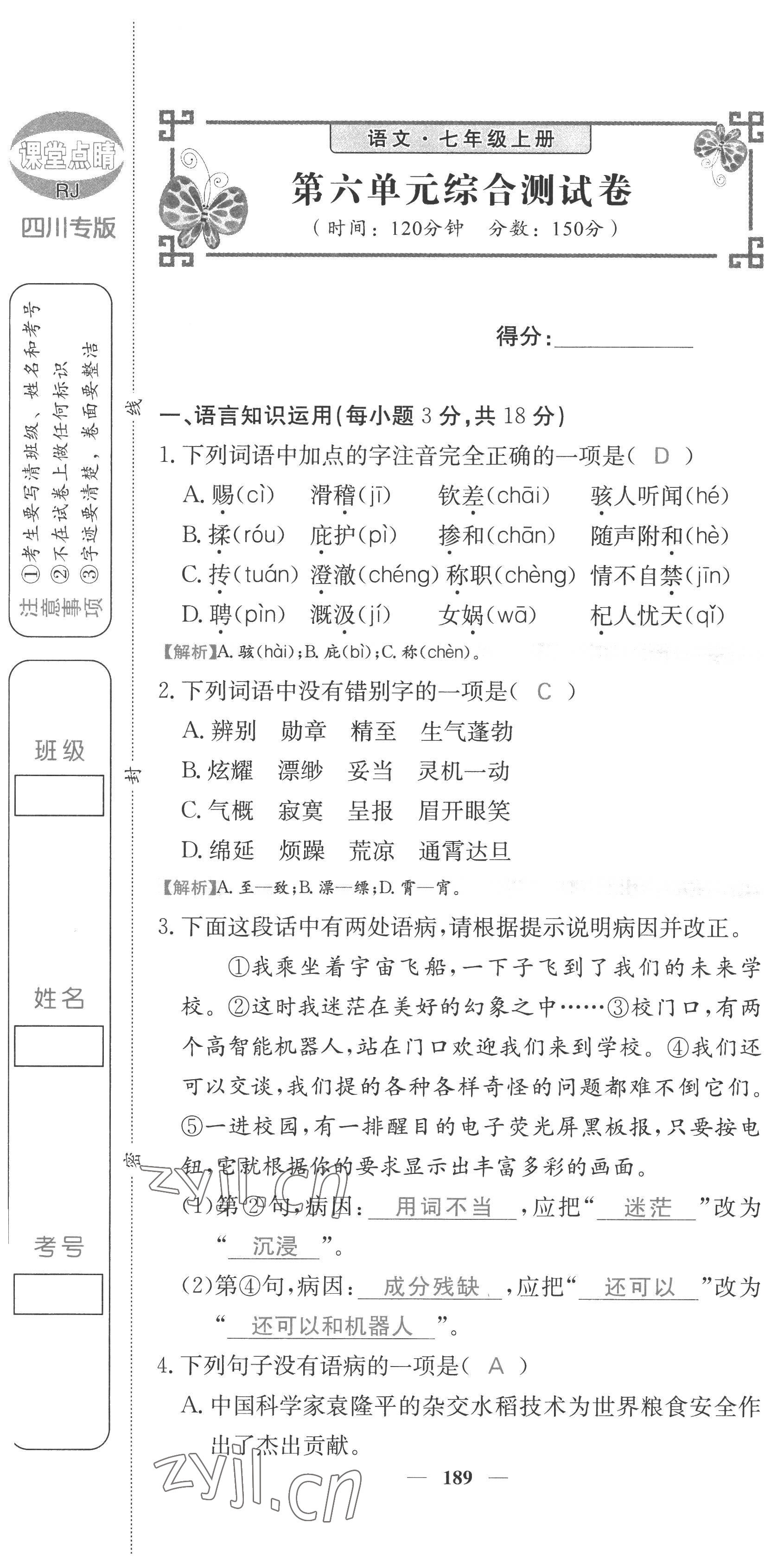 2022年课堂点睛七年级语文上册人教版四川专版