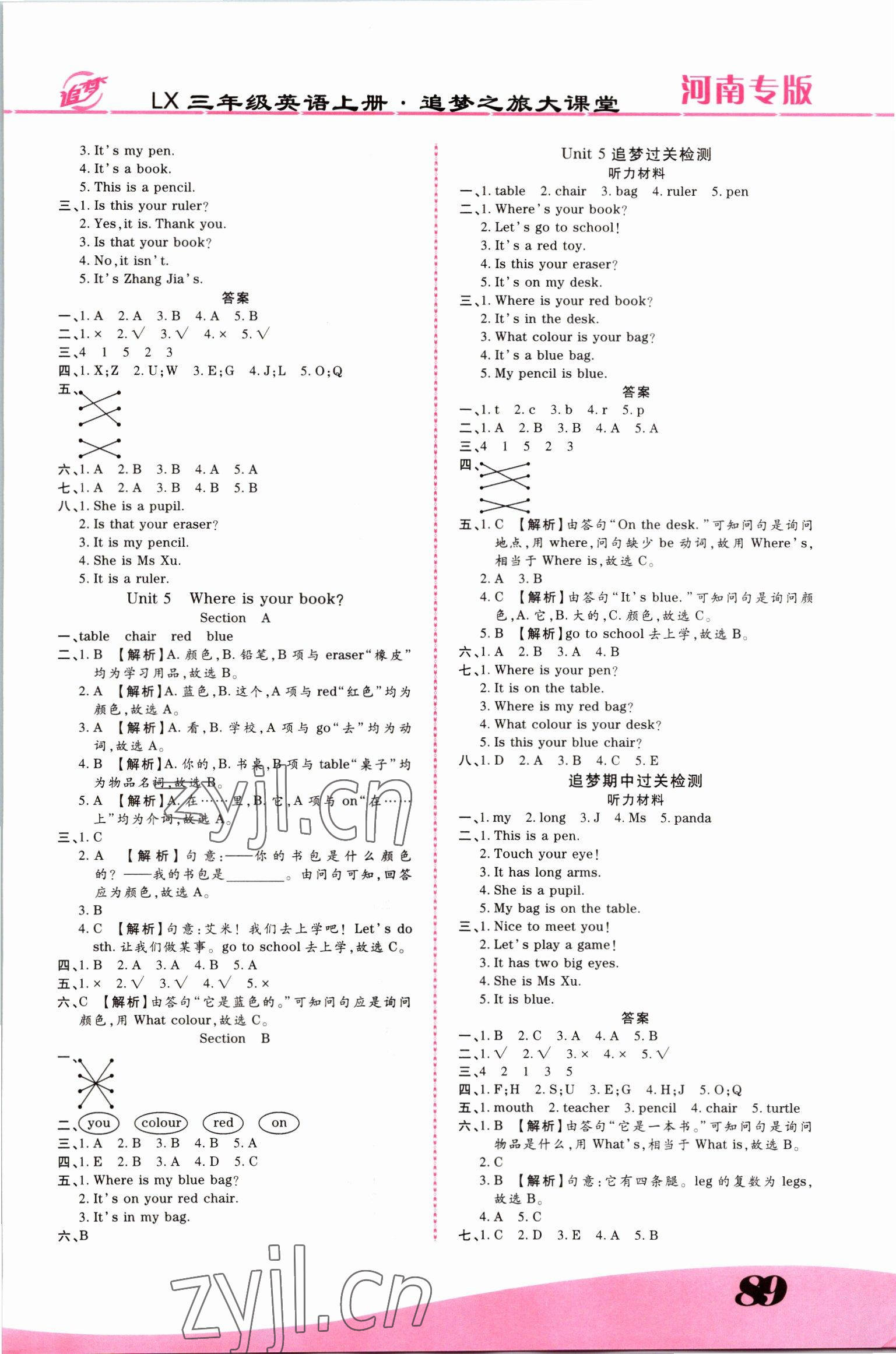 注:目前有些书本章节名称可能整理的还不是很完善,但都是按照顺序排列的,请同学们按照顺序仔细查找。练习册 2022年追梦之旅大课堂三年级英语上册鲁湘版河南专版 答案主要是用来给同学们做完题方便对答案用的,请勿直接抄袭。