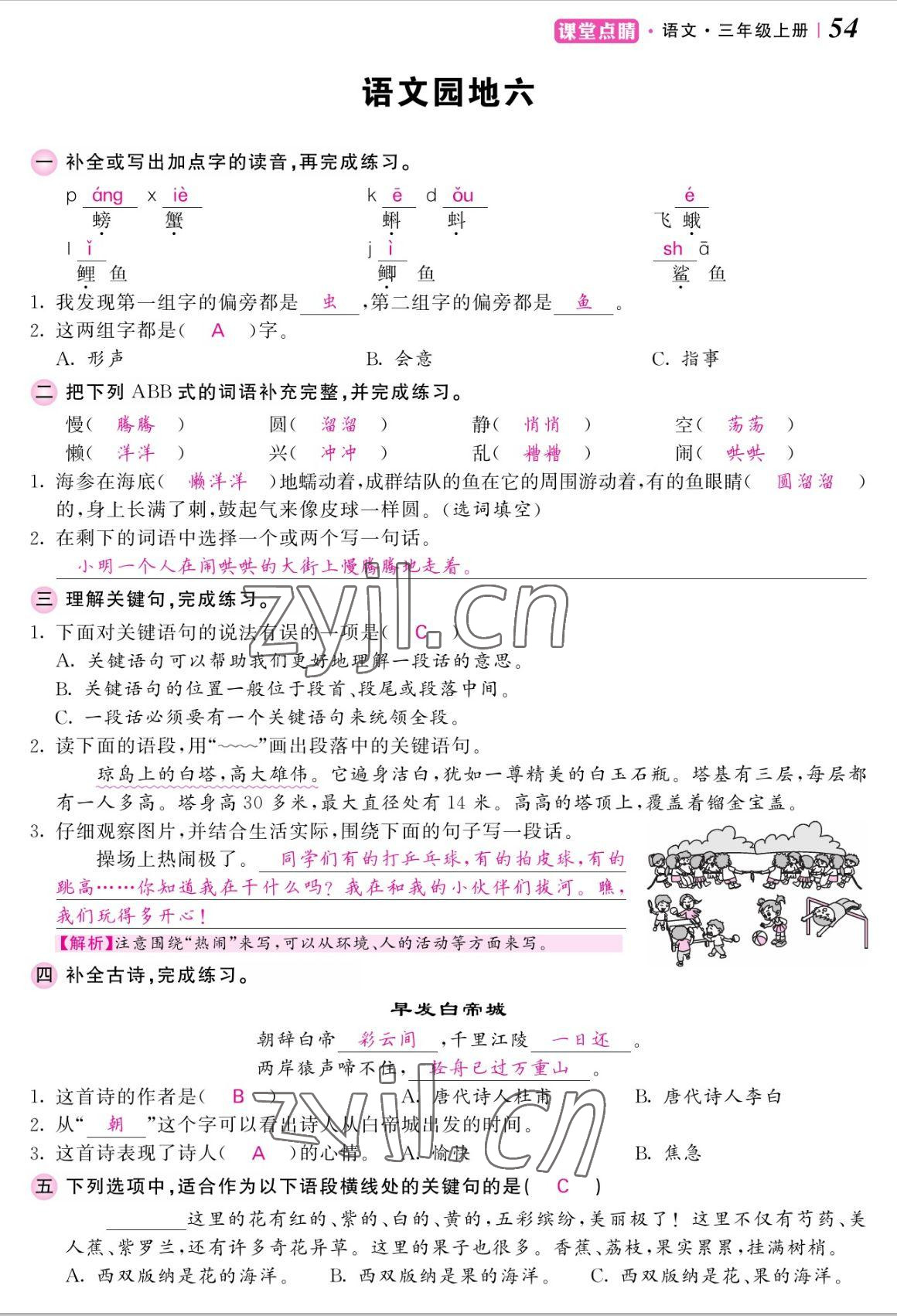 注:目前有些书本章节名称可能整理的还不是很完善,但都是按照顺序排列的,请同学们按照顺序仔细查找。练习册 2022年课堂点睛三年级语文上册人教版湖南专版 答案主要是用来给同学们做完题方便对答案用的,请勿直接抄袭。