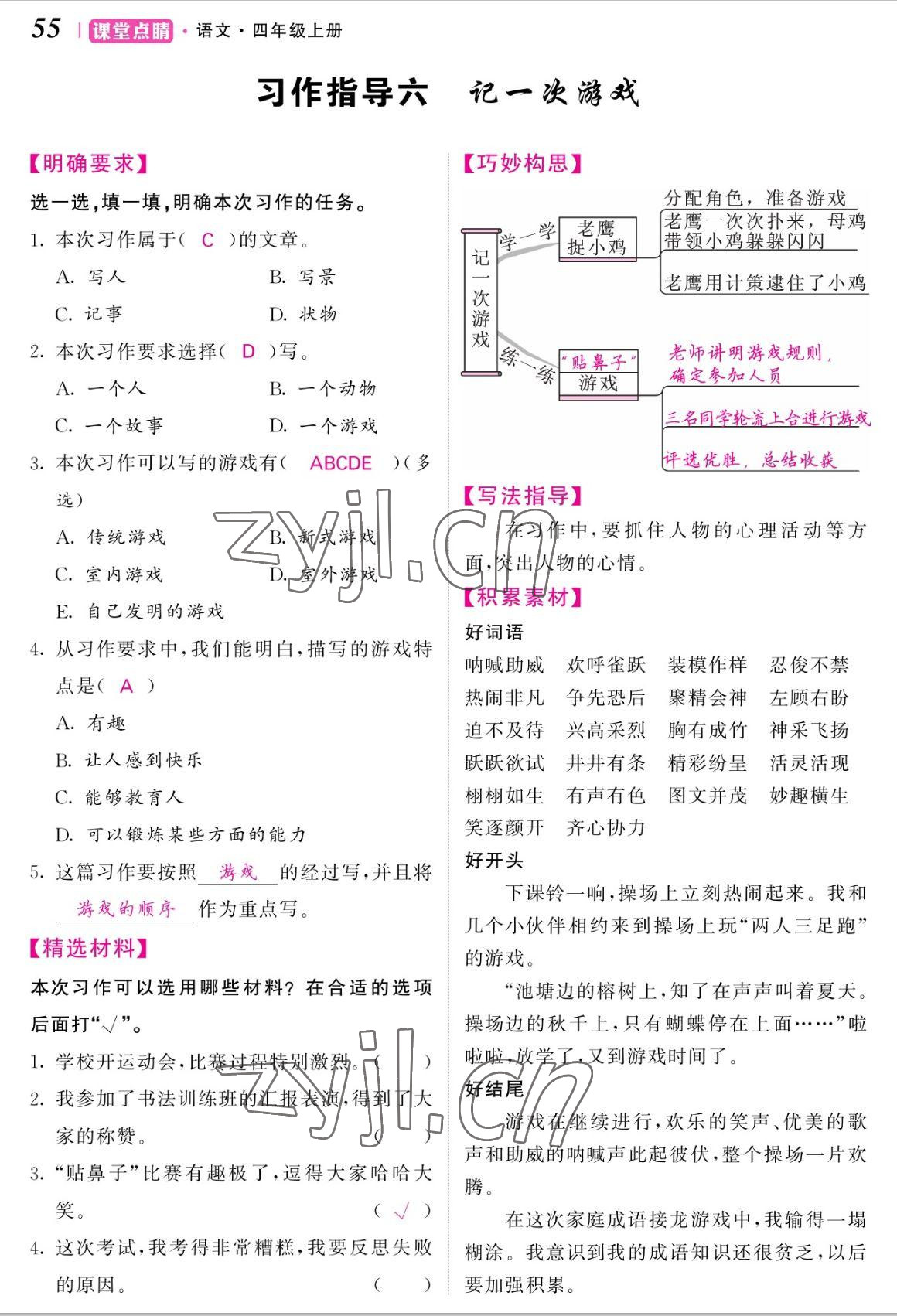 注:目前有些书本章节名称可能整理的还不是很完善,但都是按照顺序排列的,请同学们按照顺序仔细查找。练习册 2022年课堂点睛四年级语文上册人教版湖南专版 答案主要是用来给同学们做完题方便对答案用的,请勿直接抄袭。