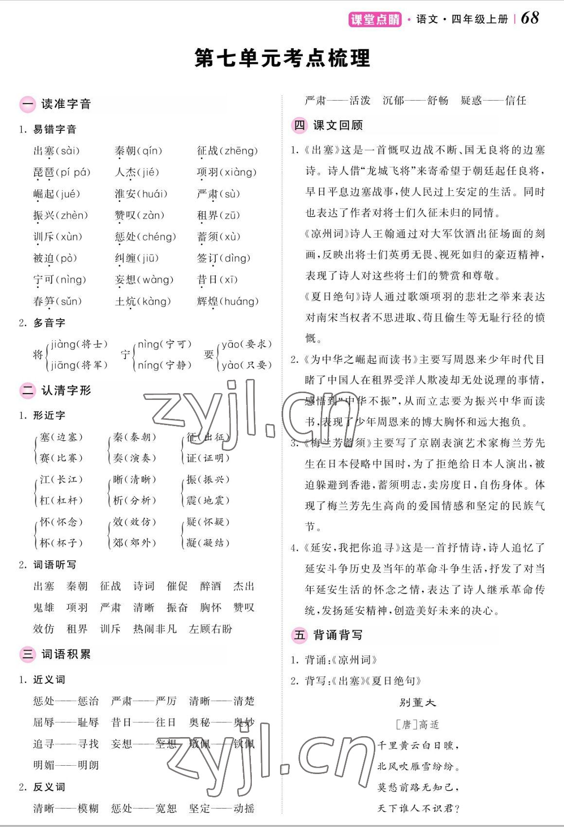 2022年课堂点睛四年级语文上册人教版湖南专版