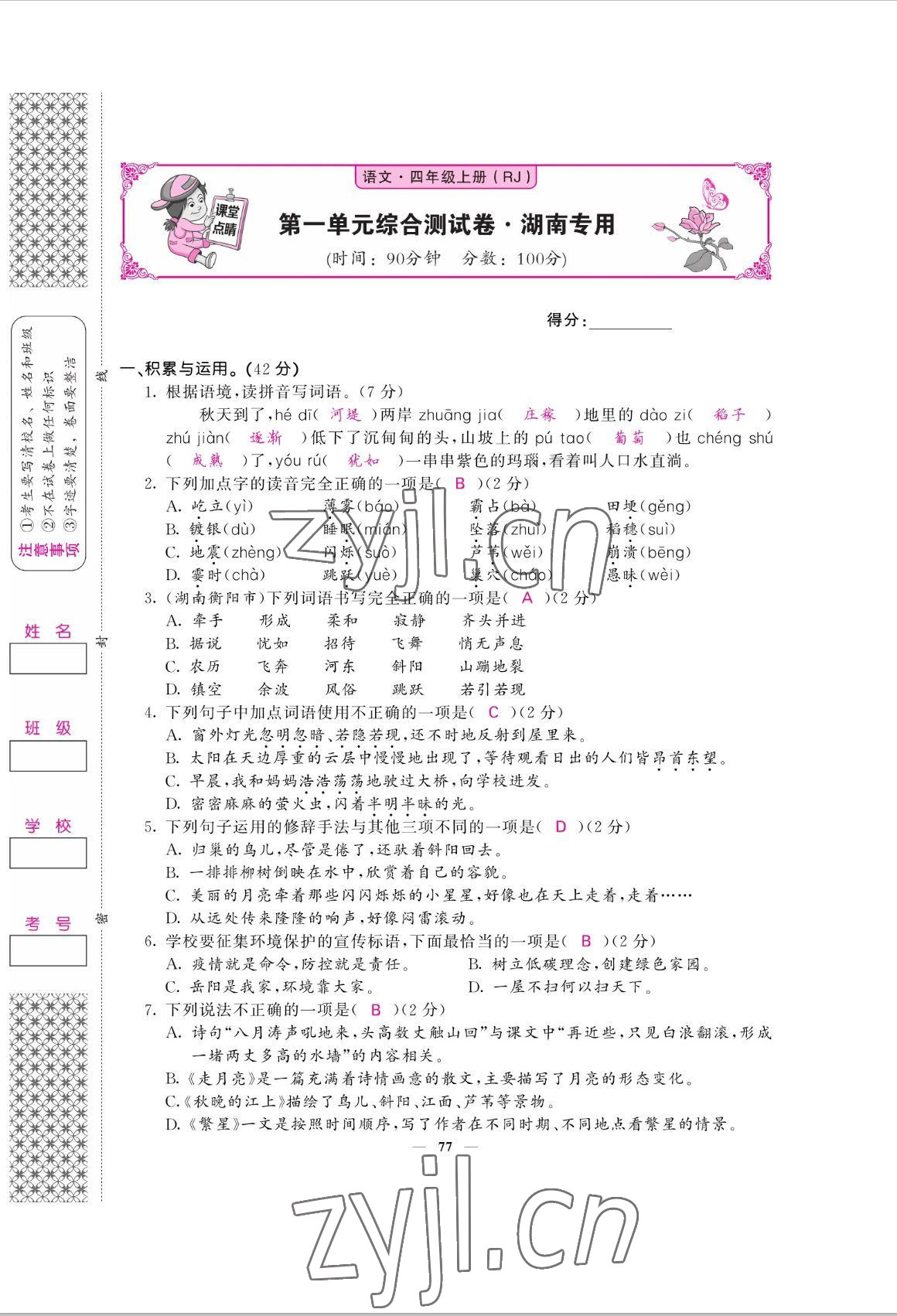 注:目前有些书本章节名称可能整理的还不是很完善,但都是按照顺序排列的,请同学们按照顺序仔细查找。练习册 2022年课堂点睛四年级语文上册人教版湖南专版 答案主要是用来给同学们做完题方便对答案用的,请勿直接抄袭。