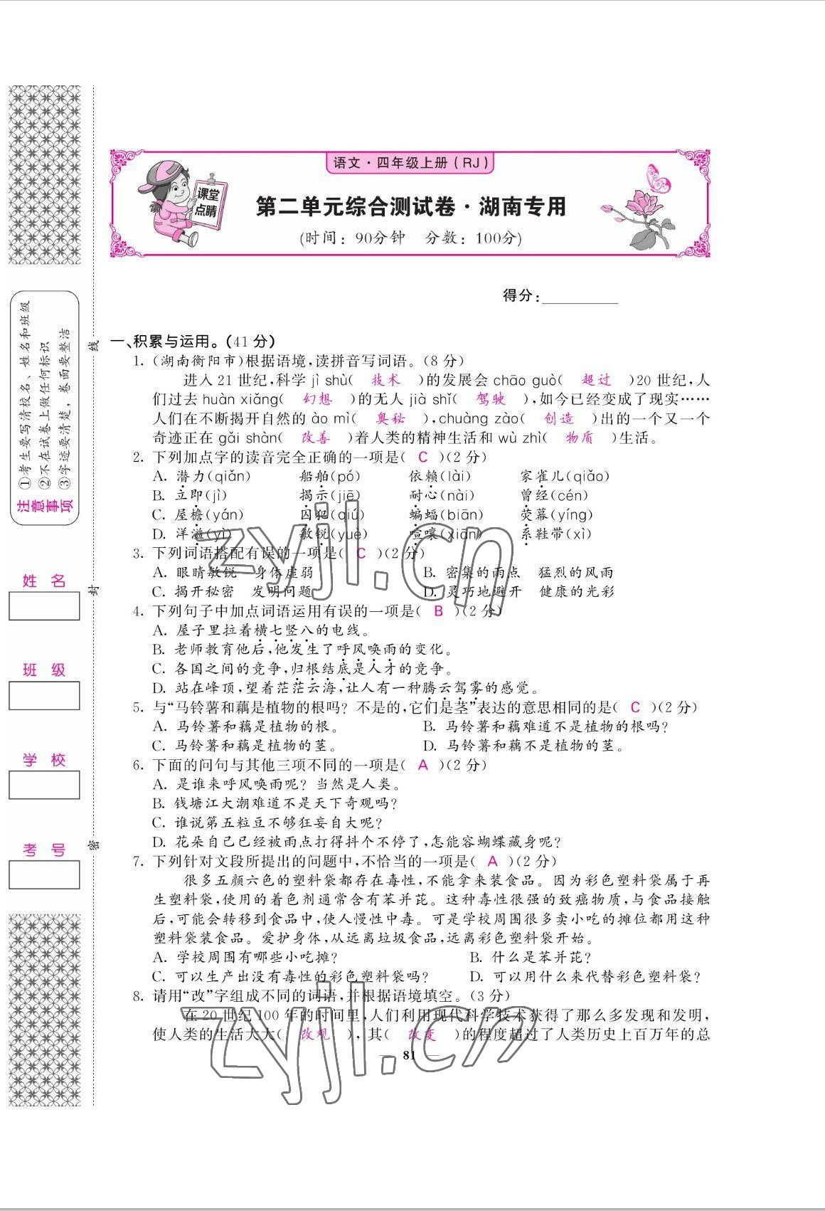 注:目前有些书本章节名称可能整理的还不是很完善,但都是按照顺序排列的,请同学们按照顺序仔细查找。练习册 2022年课堂点睛四年级语文上册人教版湖南专版 答案主要是用来给同学们做完题方便对答案用的,请勿直接抄袭。
