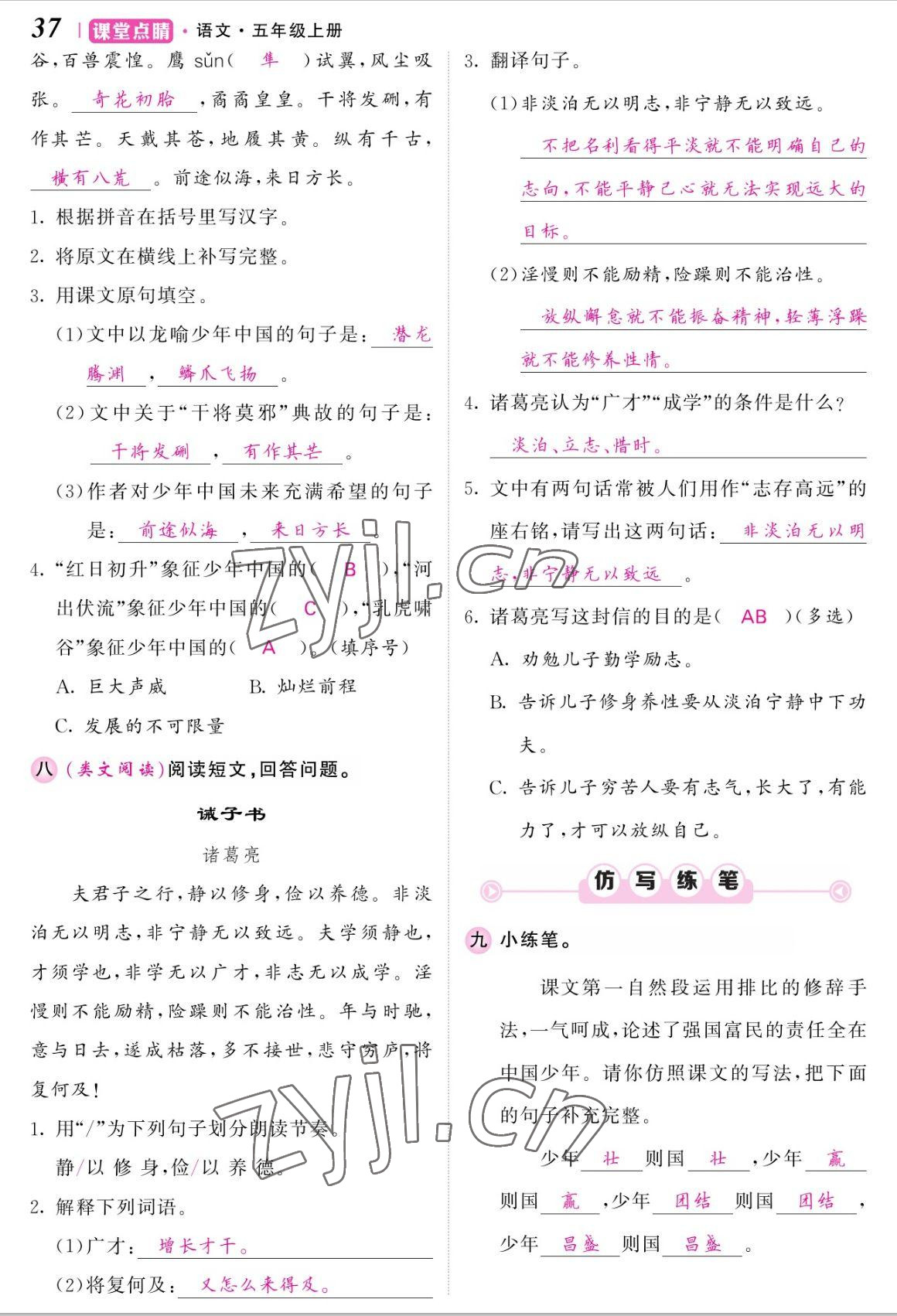 2022年课堂点睛五年级语文上册人教版湖南专版