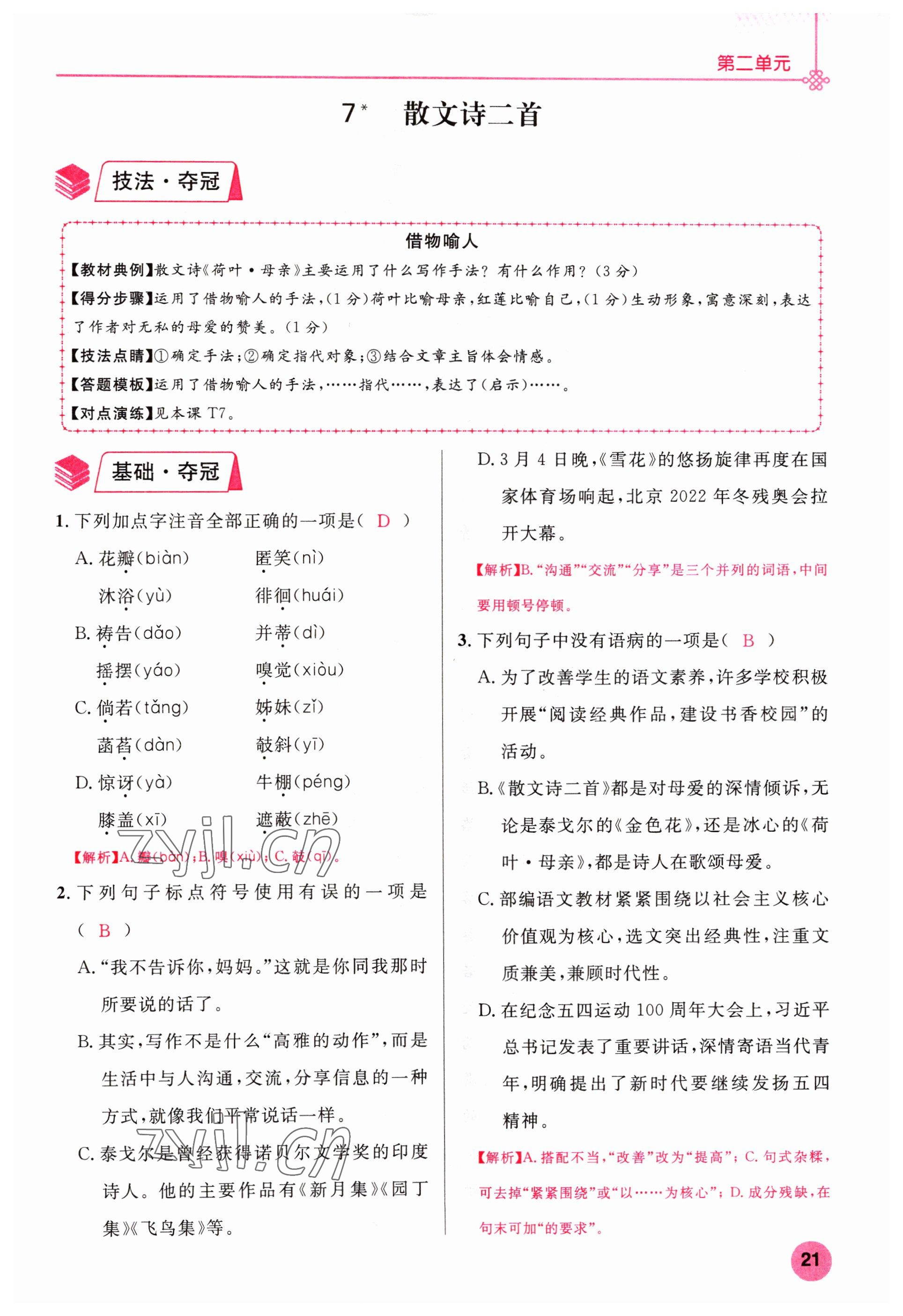 2022年课时夺冠七年级语文上册人教版黄冈孝感咸宁专版