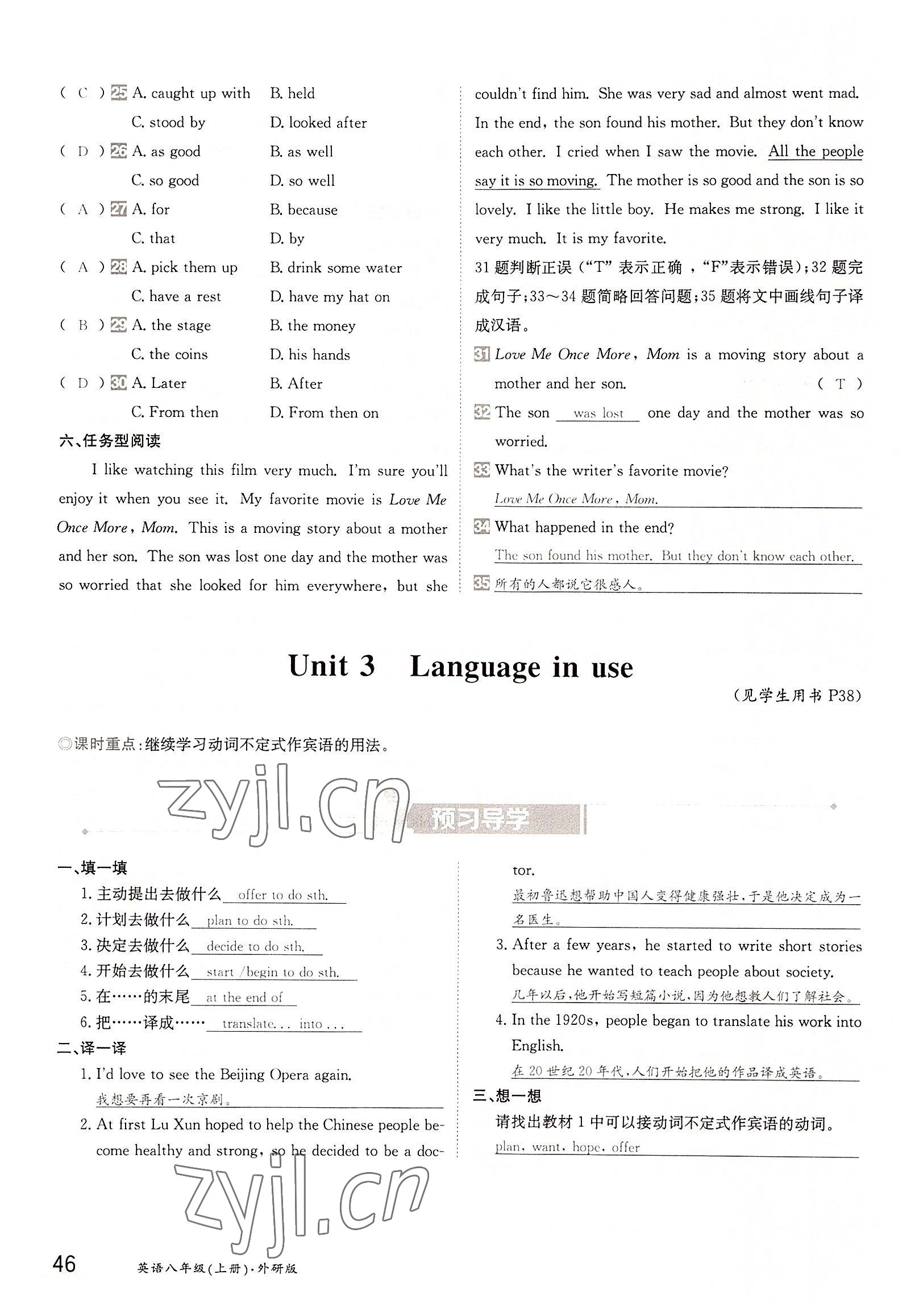 注:目前有些书本章节名称可能整理的还不是很完善,但都是按照顺序排列的,请同学们按照顺序仔细查找。练习册 2022年三段六步导学案八年级英语上册外研版 答案主要是用来给同学们做完题方便对答案用的,请勿直接抄袭。