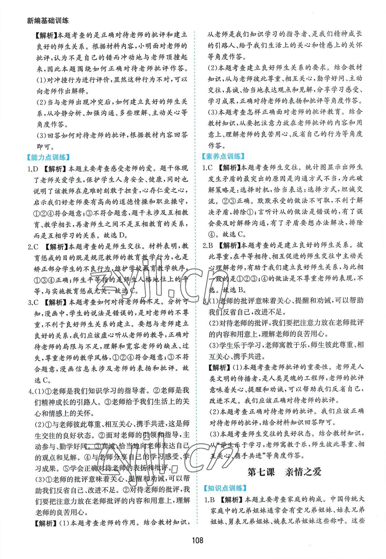 2022年新编基础训练七年级道德与法治上册人教版黄山书社
