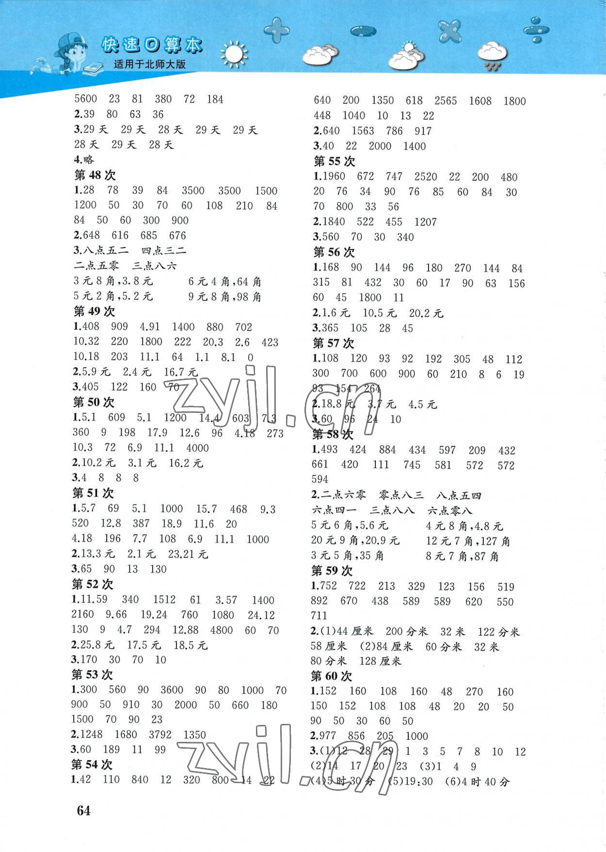 注:目前有些书本章节名称可能整理的还不是很完善,但都是按照顺序排列的,请同学们按照顺序仔细查找。练习册 2022年快速口算本三年级上册北师大版 答案主要是用来给同学们做完题方便对答案用的,请勿直接抄袭。
