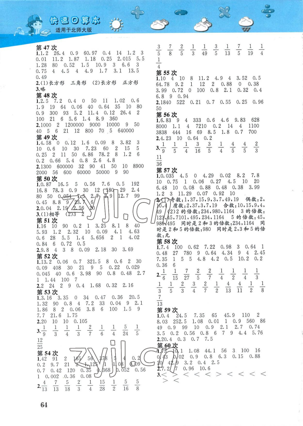 注:目前有些书本章节名称可能整理的还不是很完善,但都是按照顺序排列的,请同学们按照顺序仔细查找。练习册 2022年快速口算本五年级上册北师大版 答案主要是用来给同学们做完题方便对答案用的,请勿直接抄袭。