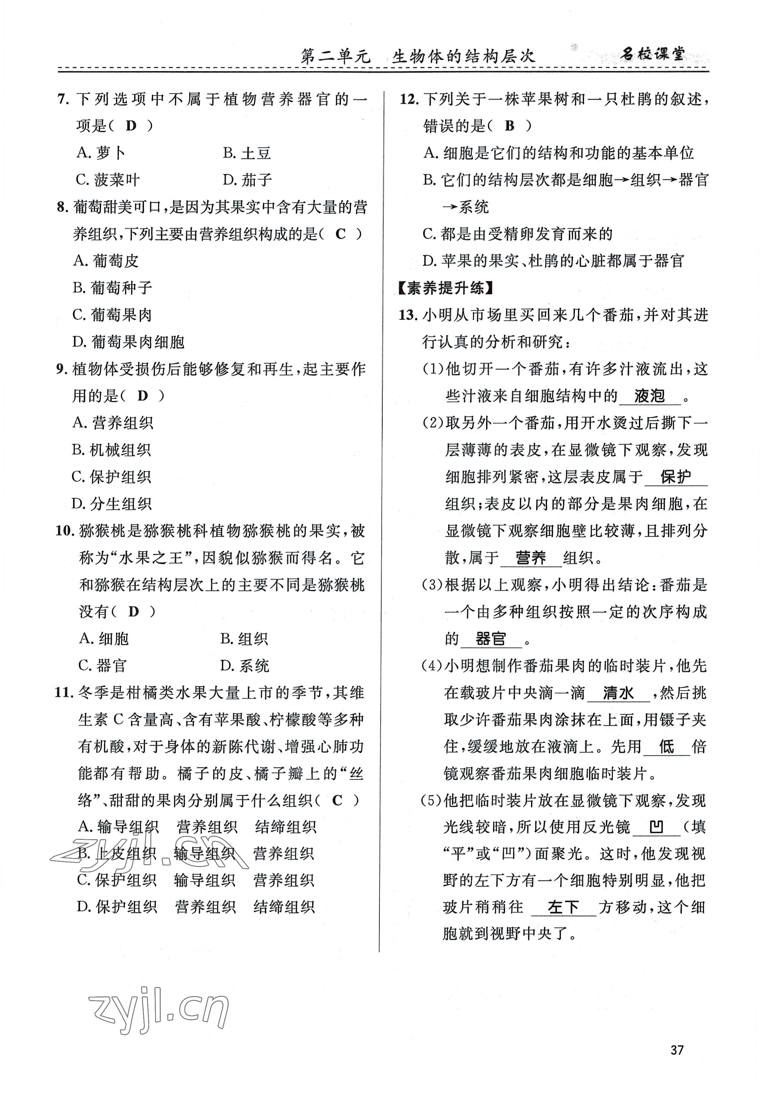 注:目前有些书本章节名称可能整理的还不是很完善,但都是按照顺序排列的,请同学们按照顺序仔细查找。练习册 2022年名校课堂贵州人民出版社七年级生物上册人教版 答案主要是用来给同学们做完题方便对答案用的,请勿直接抄袭。