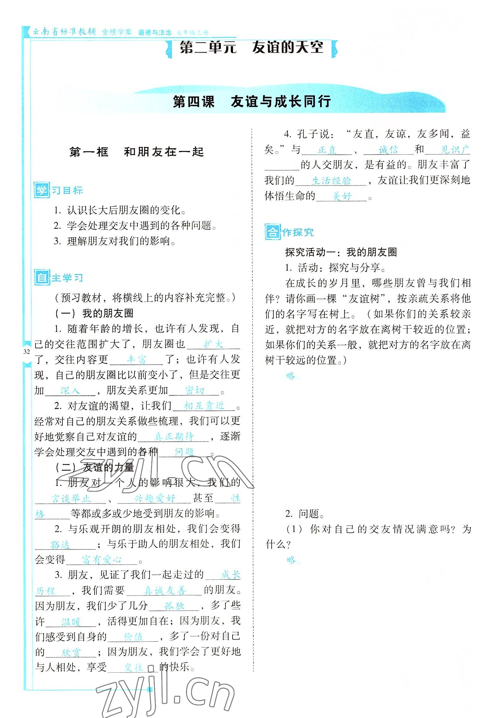 注:目前有些书本章节名称可能整理的还不是很完善,但都是按照顺序排列的,请同学们按照顺序仔细查找。练习册 2022年云南省标准教辅金榜学案七年级道德与法治上册人教版云南专版 答案主要是用来给同学们做完题方便对答案用的,请勿直接抄袭。