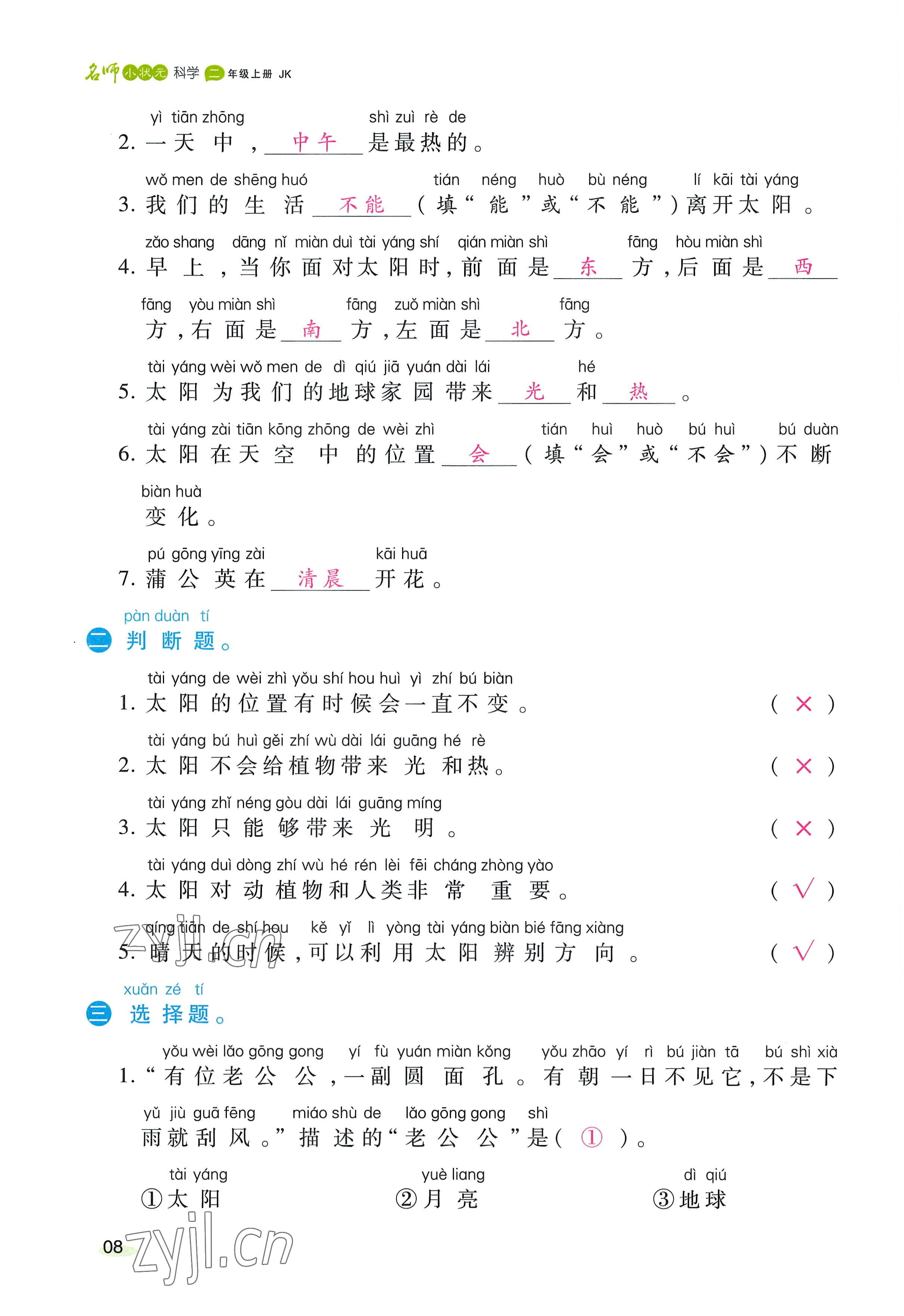 注:目前有些书本章节名称可能整理的还不是很完善,但都是按照顺序排列的,请同学们按照顺序仔细查找。练习册 2022年名师小状元课时作业本二年级科学上册教科版 答案主要是用来给同学们做完题方便对答案用的,请勿直接抄袭。