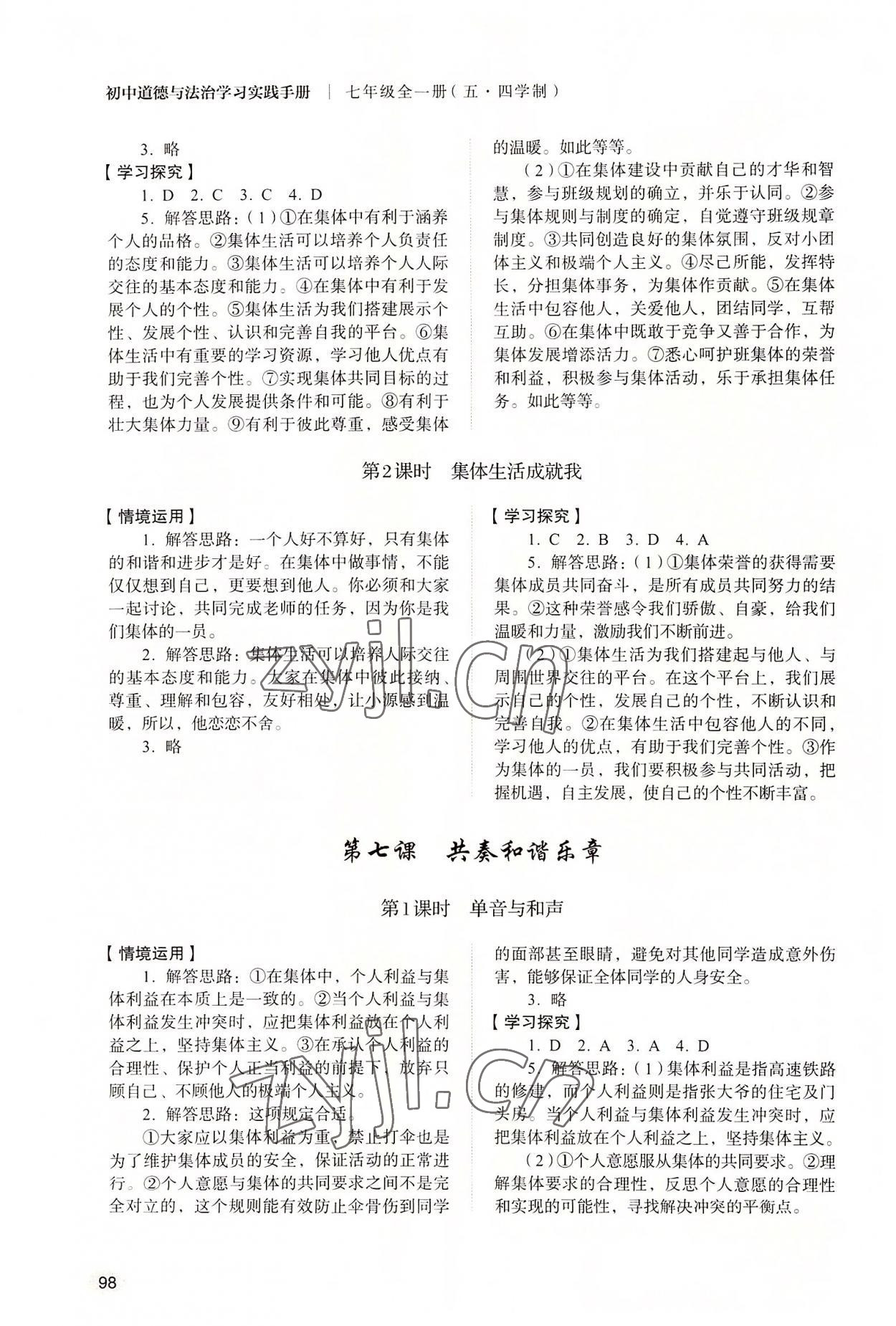 注:目前有些书本章节名称可能整理的还不是很完善,但都是按照顺序排列的,请同学们按照顺序仔细查找。练习册 2022年初中道德与法治学习实践手册七年级全一册人教版五四制 答案主要是用来给同学们做完题方便对答案用的,请勿直接抄袭。