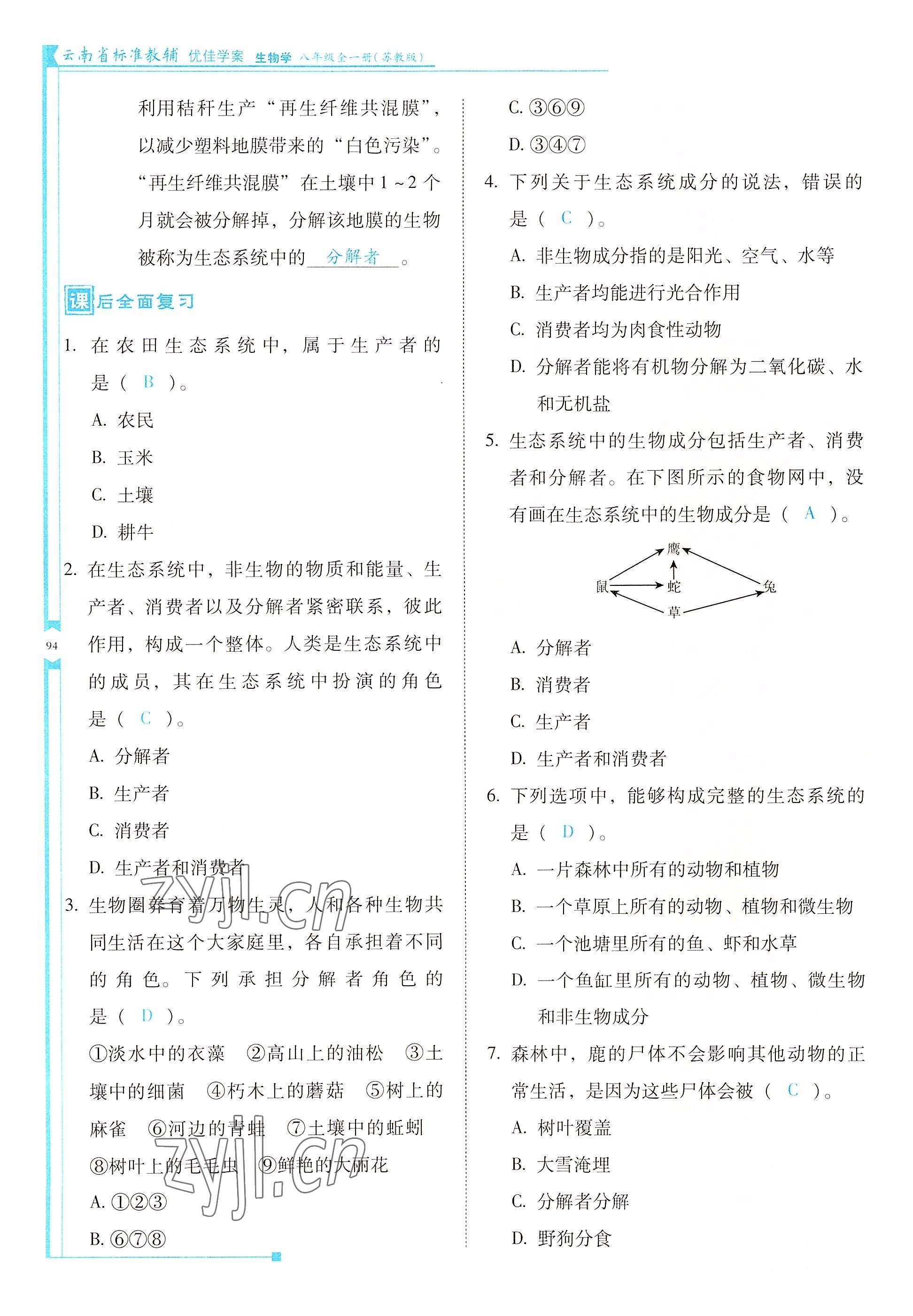 注:目前有些书本章节名称可能整理的还不是很完善,但都是按照顺序排列的,请同学们按照顺序仔细查找。练习册 2022年云南省标准教辅优佳学案八年级生物全一册苏教版 答案主要是用来给同学们做完题方便对答案用的,请勿直接抄袭。