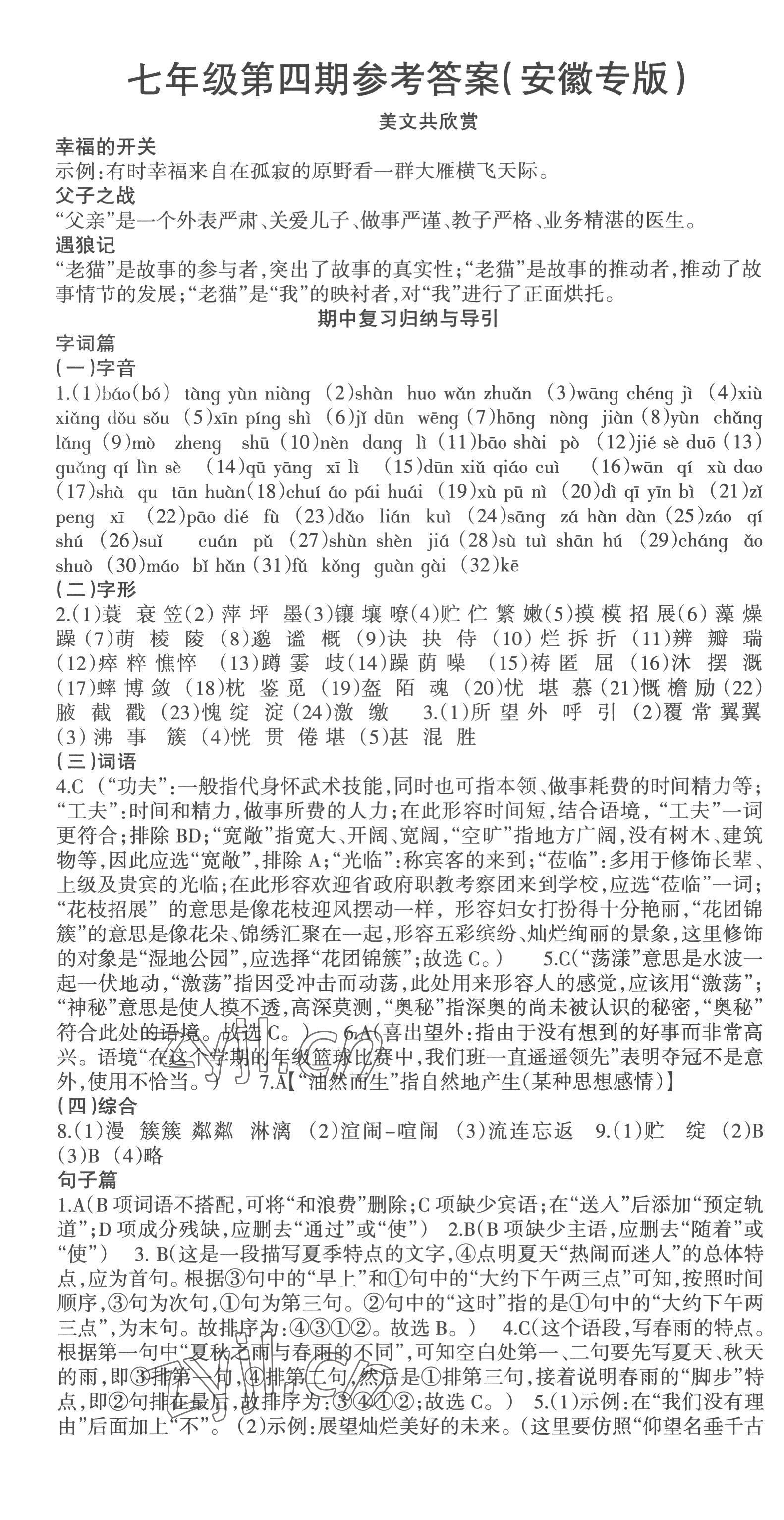 注:目前有些书本章节名称可能整理的还不是很完善,但都是按照顺序排列的,请同学们按照顺序仔细查找。练习册 2022年语文活页七年级语文全一册人教版安徽专版 答案主要是用来给同学们做完题方便对答案用的,请勿直接抄袭。
