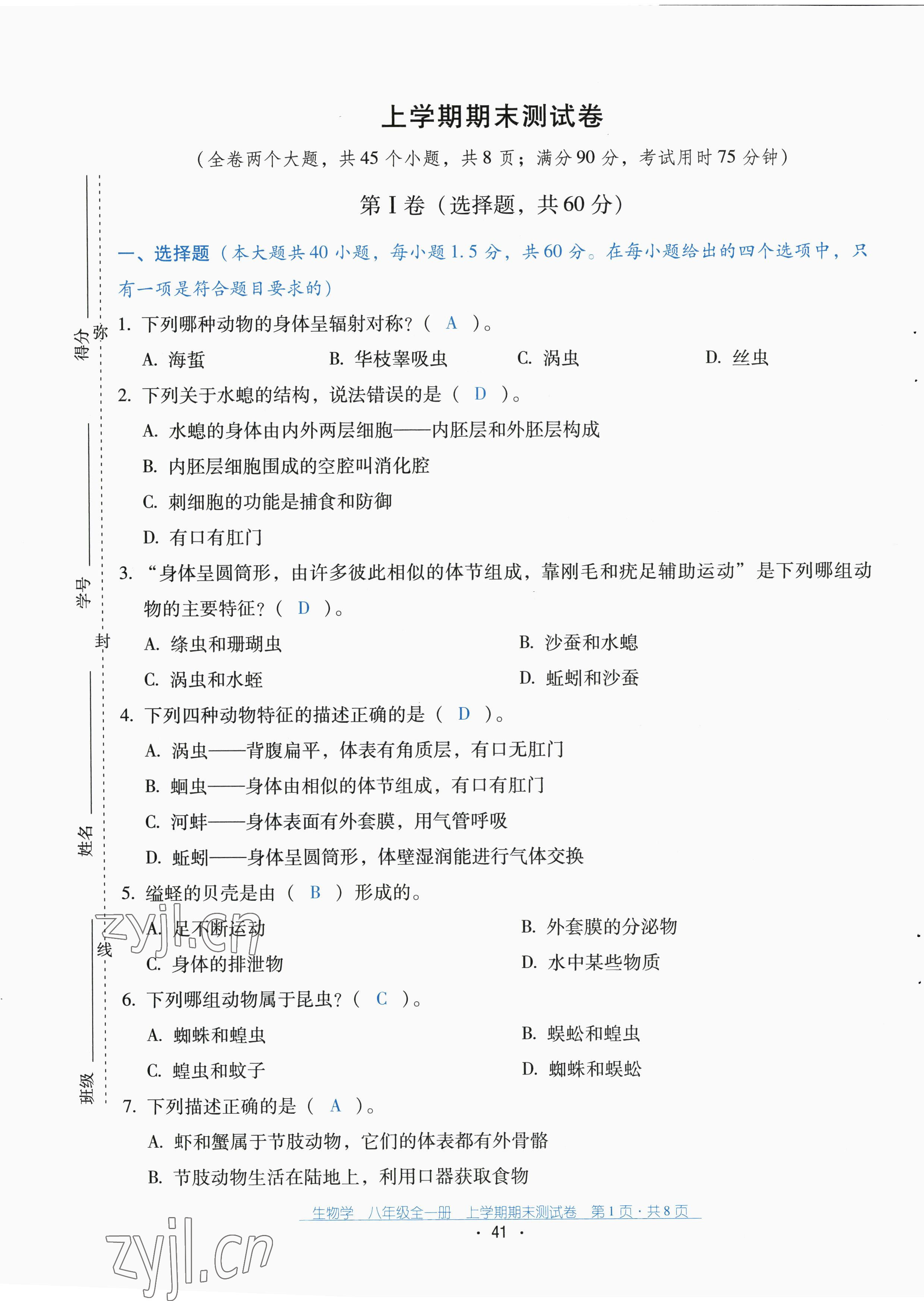 注:目前有些书本章节名称可能整理的还不是很完善,但都是按照顺序排列的,请同学们按照顺序仔细查找。练习册 2022年云南省标准教辅优佳学案配套测试卷八年级生物全一册人教版 答案主要是用来给同学们做完题方便对答案用的,请勿直接抄袭。