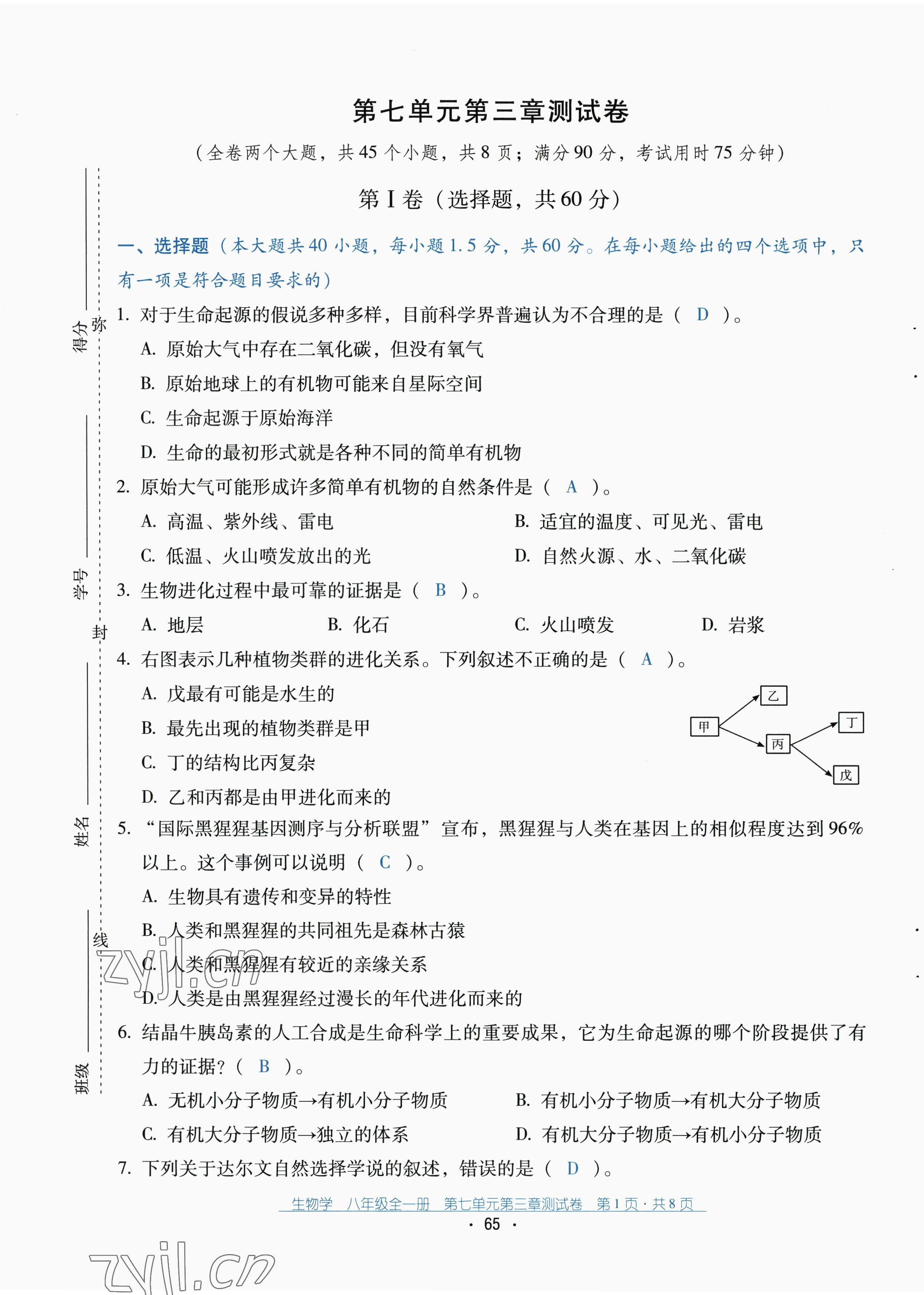 注:目前有些书本章节名称可能整理的还不是很完善,但都是按照顺序排列的,请同学们按照顺序仔细查找。练习册 2022年云南省标准教辅优佳学案配套测试卷八年级生物全一册人教版 答案主要是用来给同学们做完题方便对答案用的,请勿直接抄袭。