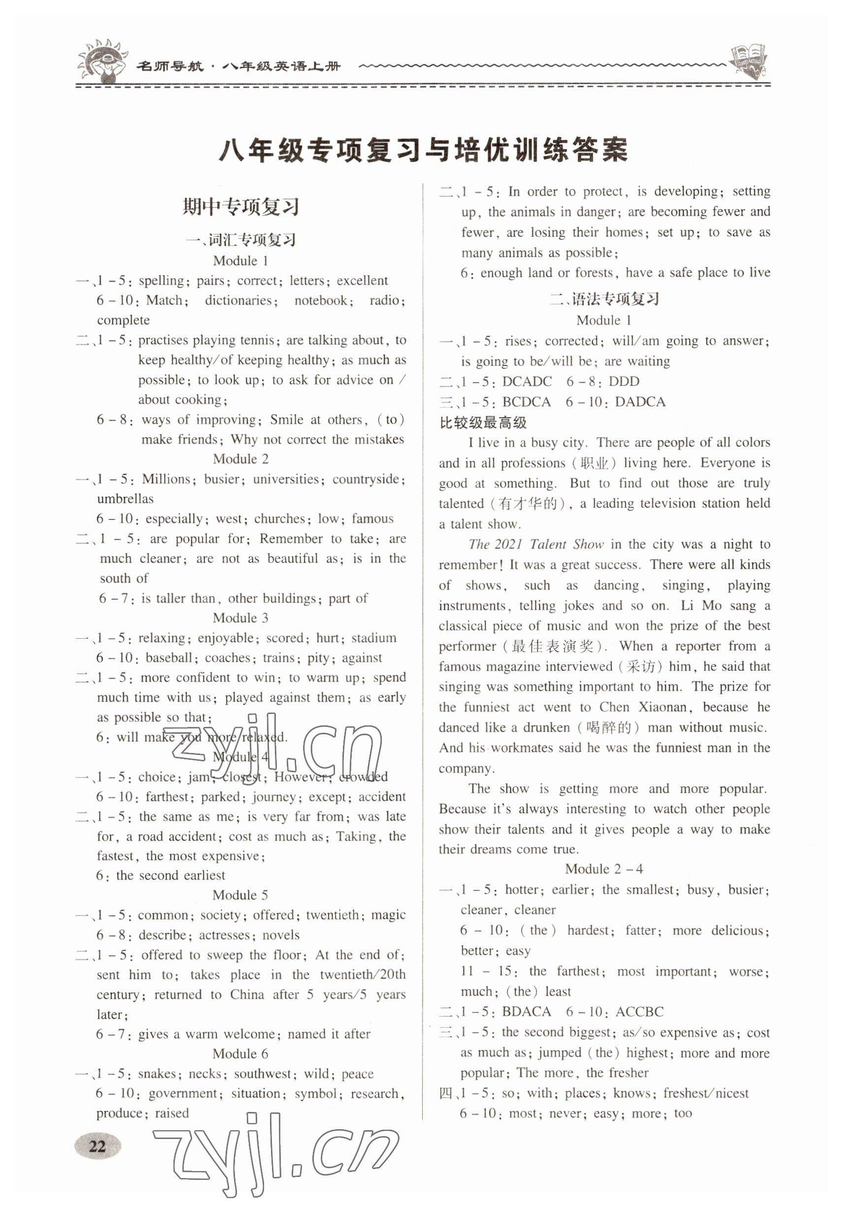 注:目前有些书本章节名称可能整理的还不是很完善,但都是按照顺序排列的,请同学们按照顺序仔细查找。练习册 2022年名师导航同步练与测八年级英语上册外研版 答案主要是用来给同学们做完题方便对答案用的,请勿直接抄袭。