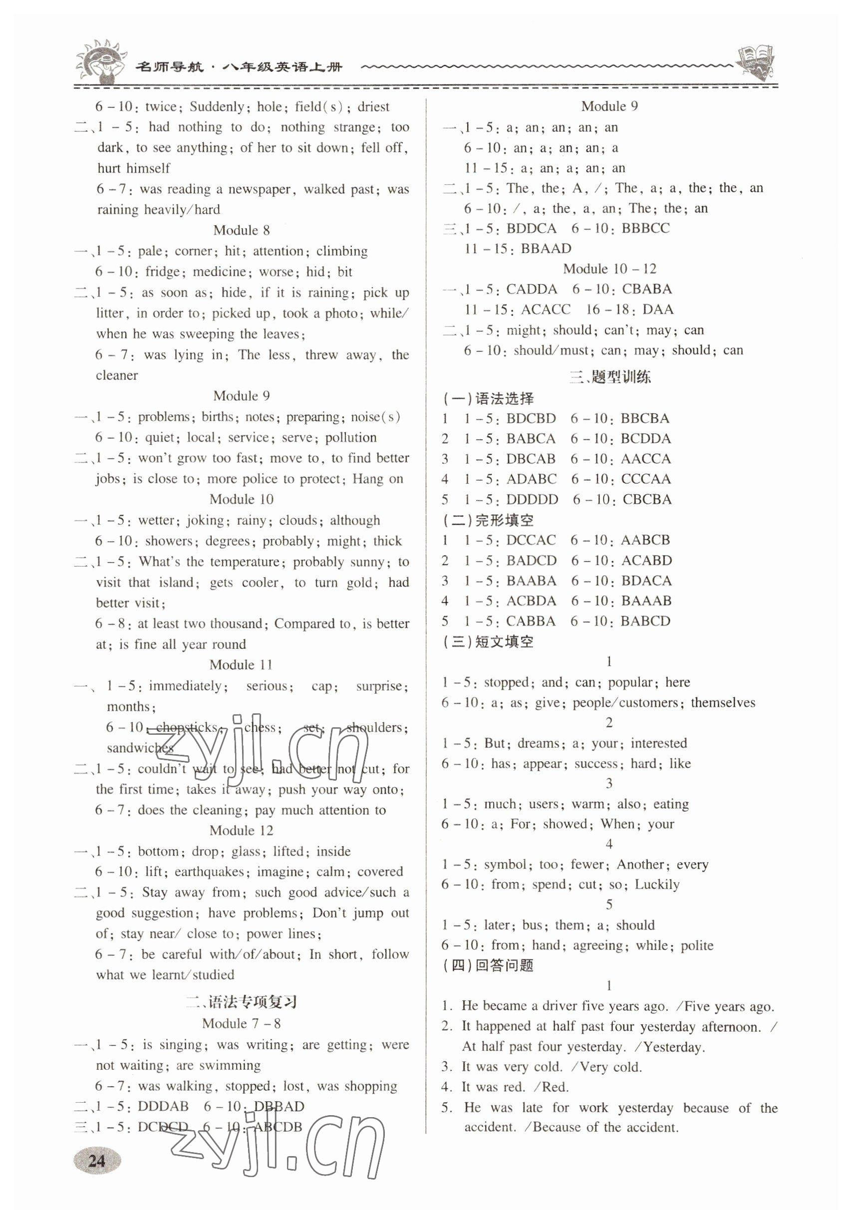 注:目前有些书本章节名称可能整理的还不是很完善,但都是按照顺序排列的,请同学们按照顺序仔细查找。练习册 2022年名师导航同步练与测八年级英语上册外研版 答案主要是用来给同学们做完题方便对答案用的,请勿直接抄袭。
