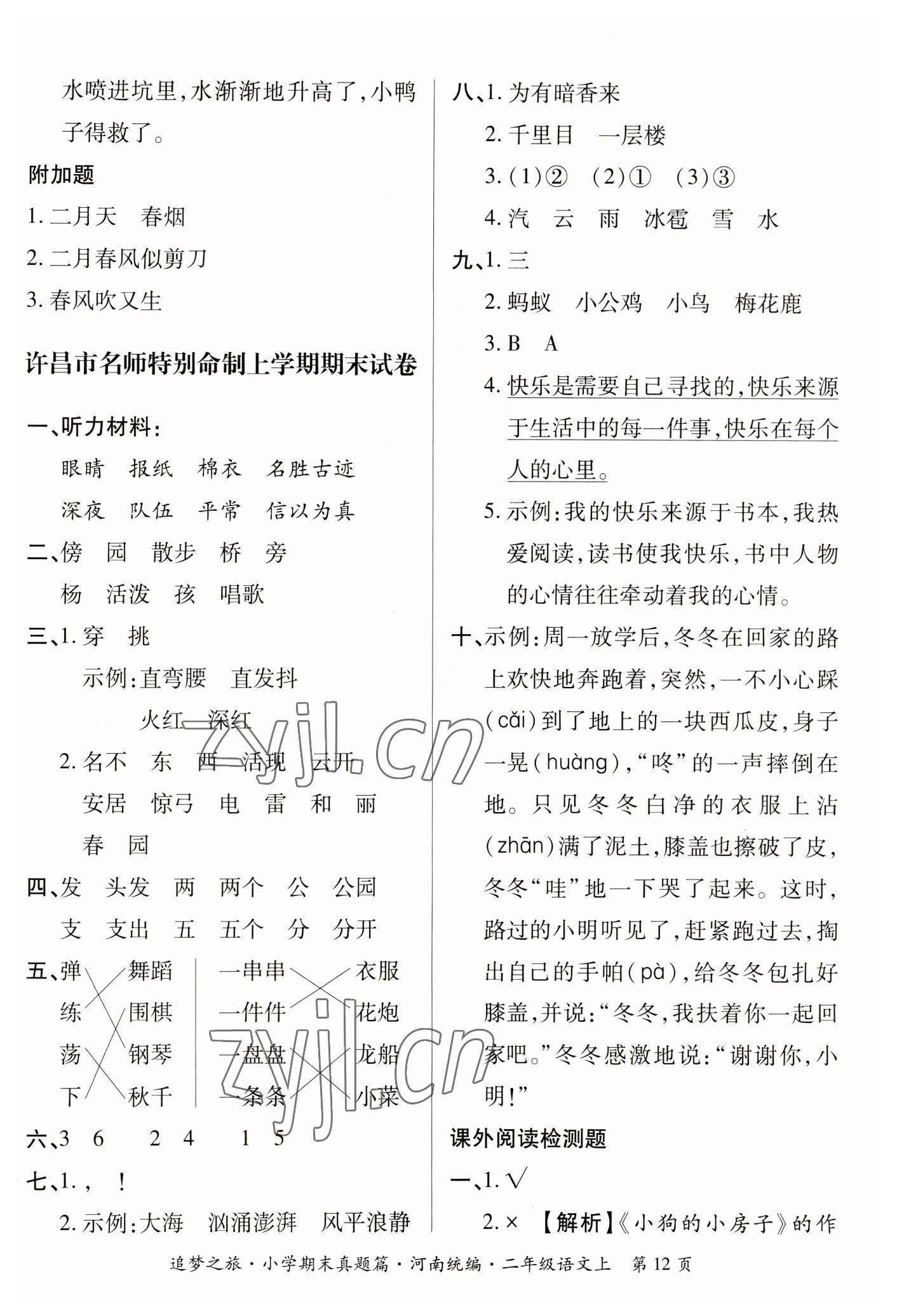 2022年追梦之旅小学期末真题篇二年级语文上册人教版河南专版