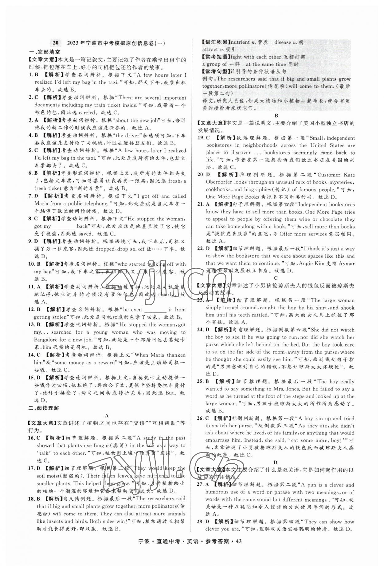 注:目前有些书本章节名称可能整理的还不是很完善,但都是按照顺序排列的,请同学们按照顺序仔细查找。练习册 2023年直通中考中考试题精编九年级英语宁波专版 答案主要是用来给同学们做完题方便对答案用的,请勿直接抄袭。