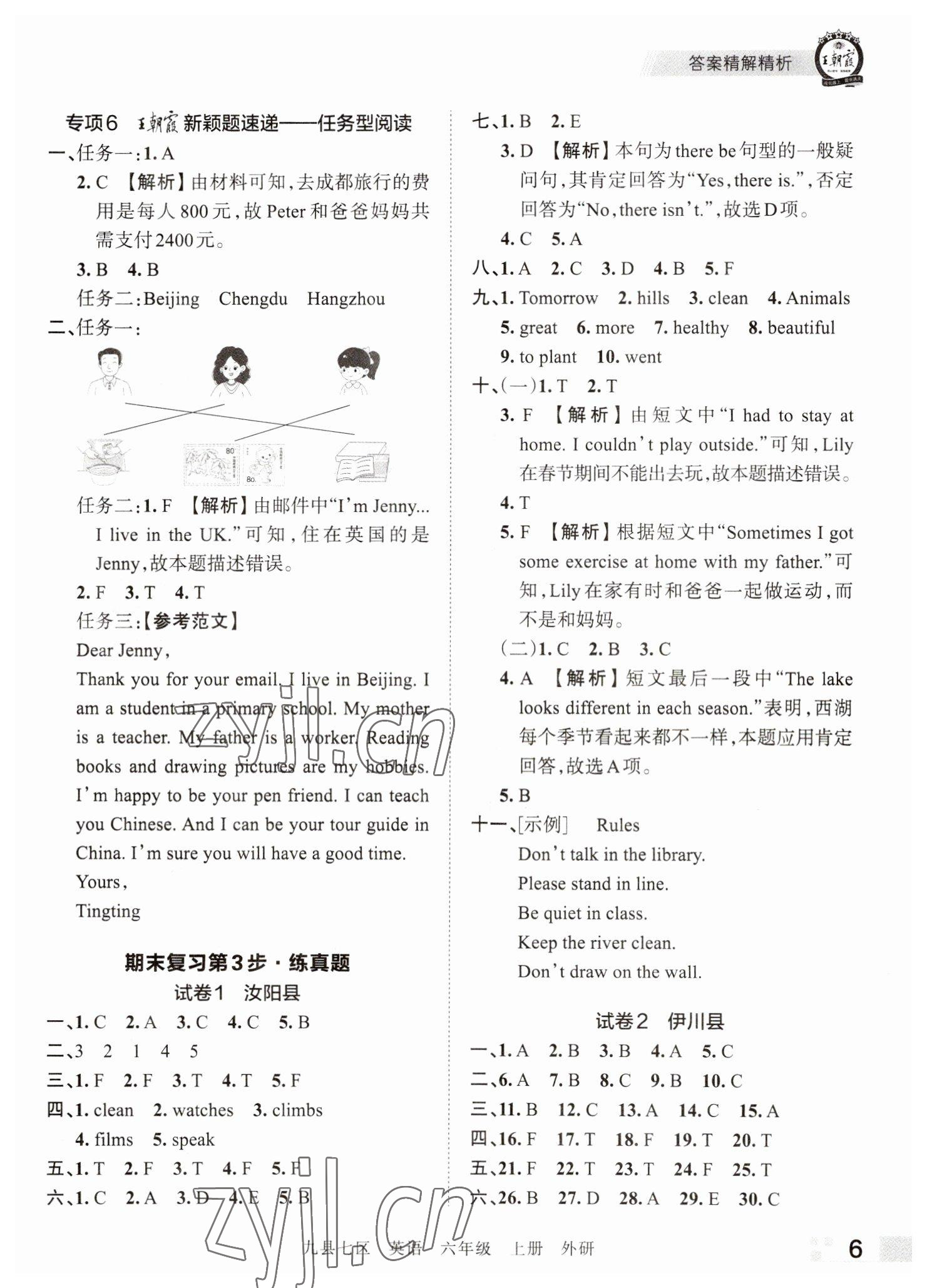 注:目前有些书本章节名称可能整理的还不是很完善,但都是按照顺序排列的,请同学们按照顺序仔细查找。练习册 2022年王朝霞各地期末试卷精选六年级英语上册外研版洛阳专版 答案主要是用来给同学们做完题方便对答案用的,请勿直接抄袭。