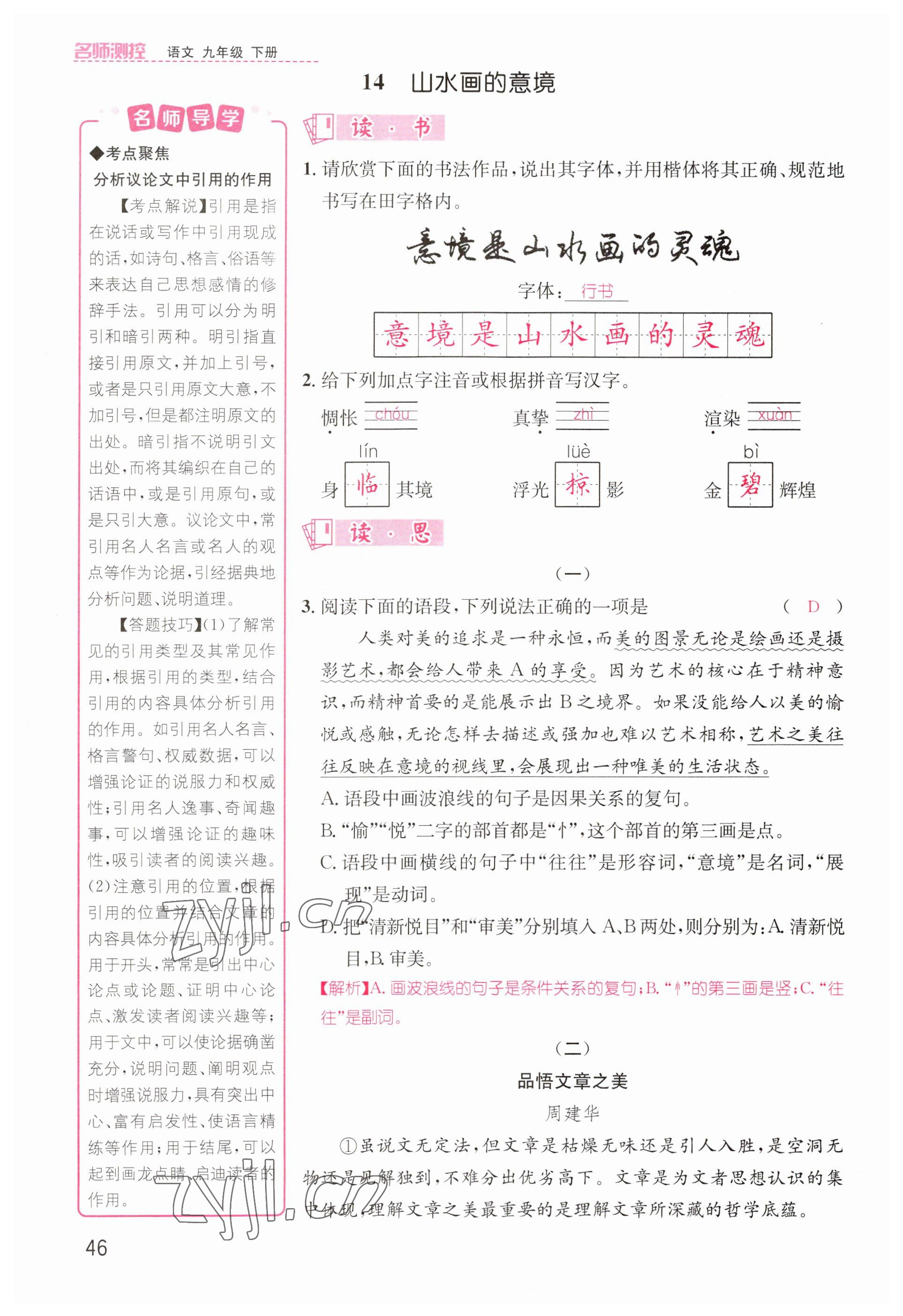 注:目前有些书本章节名称可能整理的还不是很完善,但都是按照顺序排列的,请同学们按照顺序仔细查找。练习册 2023年名师测控九年级语文下册人教版山西专版 答案主要是用来给同学们做完题方便对答案用的,请勿直接抄袭。