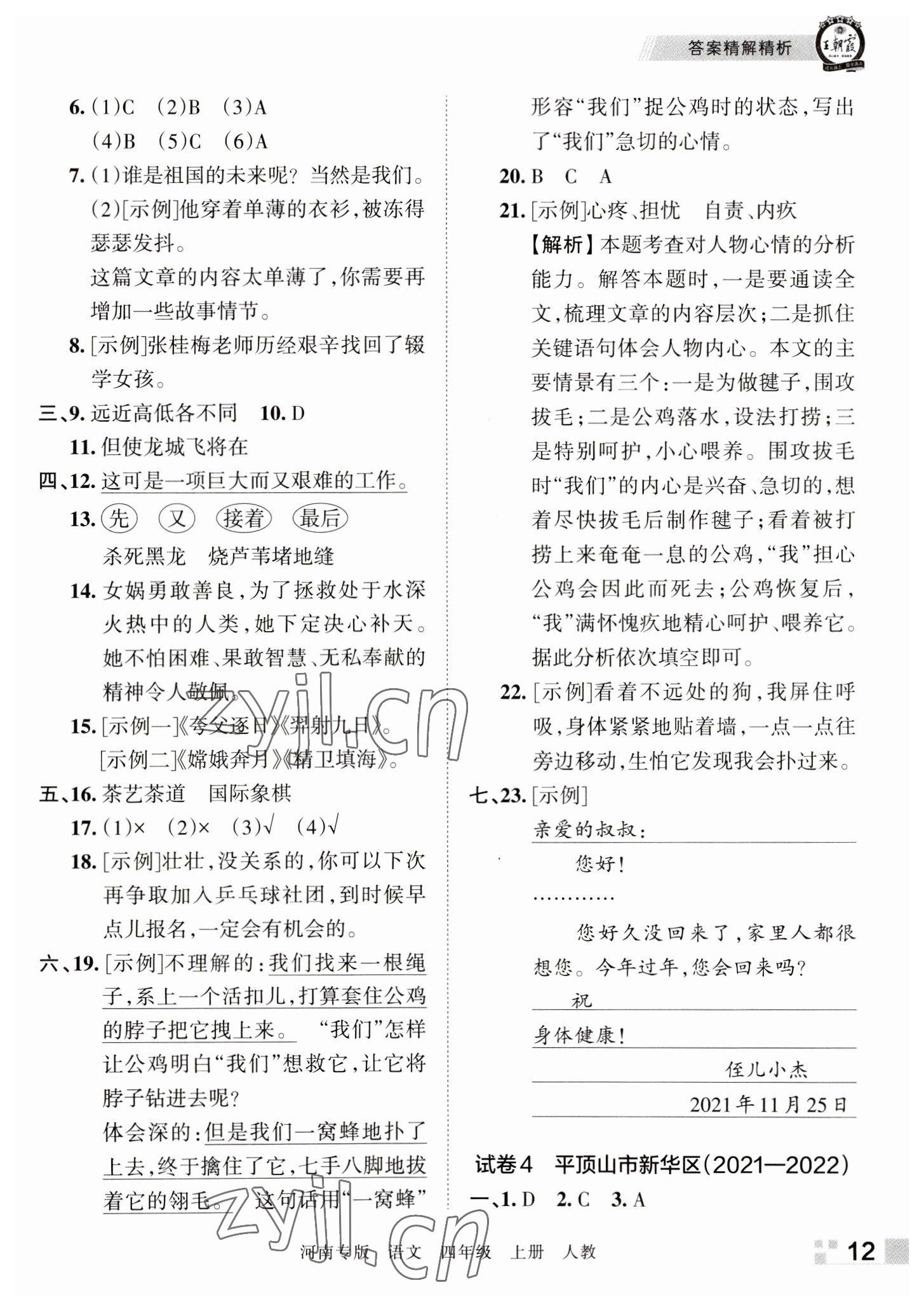 注:目前有些书本章节名称可能整理的还不是很完善,但都是按照顺序排列的,请同学们按照顺序仔细查找。练习册 2022年王朝霞各地期末试卷精选四年级语文上册人教版河南专版 答案主要是用来给同学们做完题方便对答案用的,请勿直接抄袭。