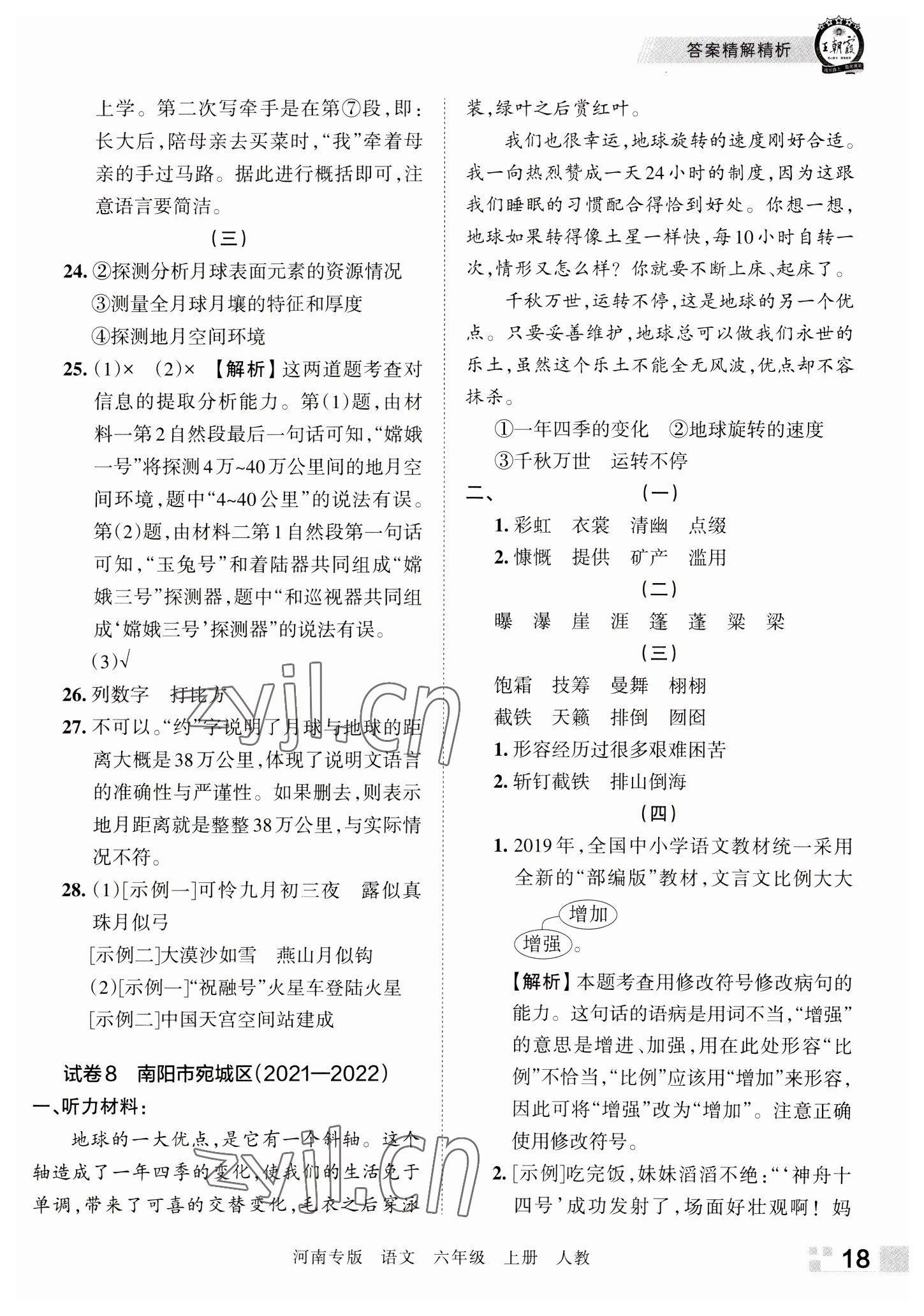 注:目前有些书本章节名称可能整理的还不是很完善,但都是按照顺序排列的,请同学们按照顺序仔细查找。练习册 2022年王朝霞各地期末试卷精选六年级语文上册人教版河南专版 答案主要是用来给同学们做完题方便对答案用的,请勿直接抄袭。