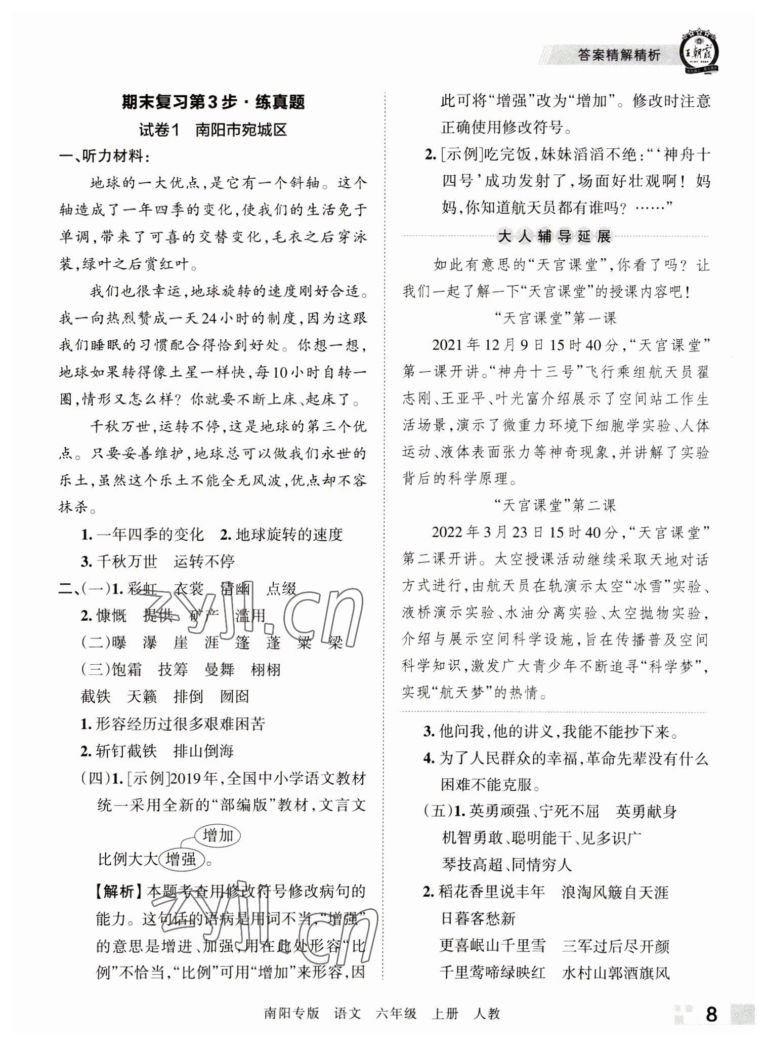 注:目前有些书本章节名称可能整理的还不是很完善,但都是按照顺序排列的,请同学们按照顺序仔细查找。练习册 2022年王朝霞期末真题精编六年级语文上册人教版南阳专版 答案主要是用来给同学们做完题方便对答案用的,请勿直接抄袭。