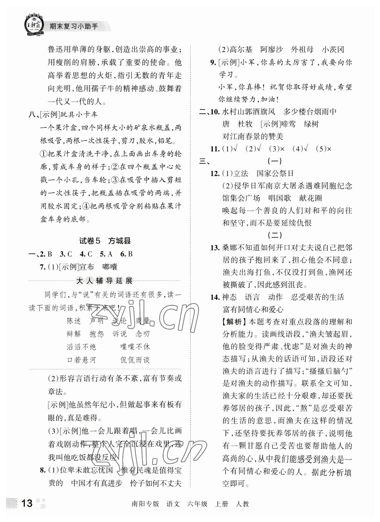 注:目前有些书本章节名称可能整理的还不是很完善,但都是按照顺序排列的,请同学们按照顺序仔细查找。练习册 2022年王朝霞期末真题精编六年级语文上册人教版南阳专版 答案主要是用来给同学们做完题方便对答案用的,请勿直接抄袭。