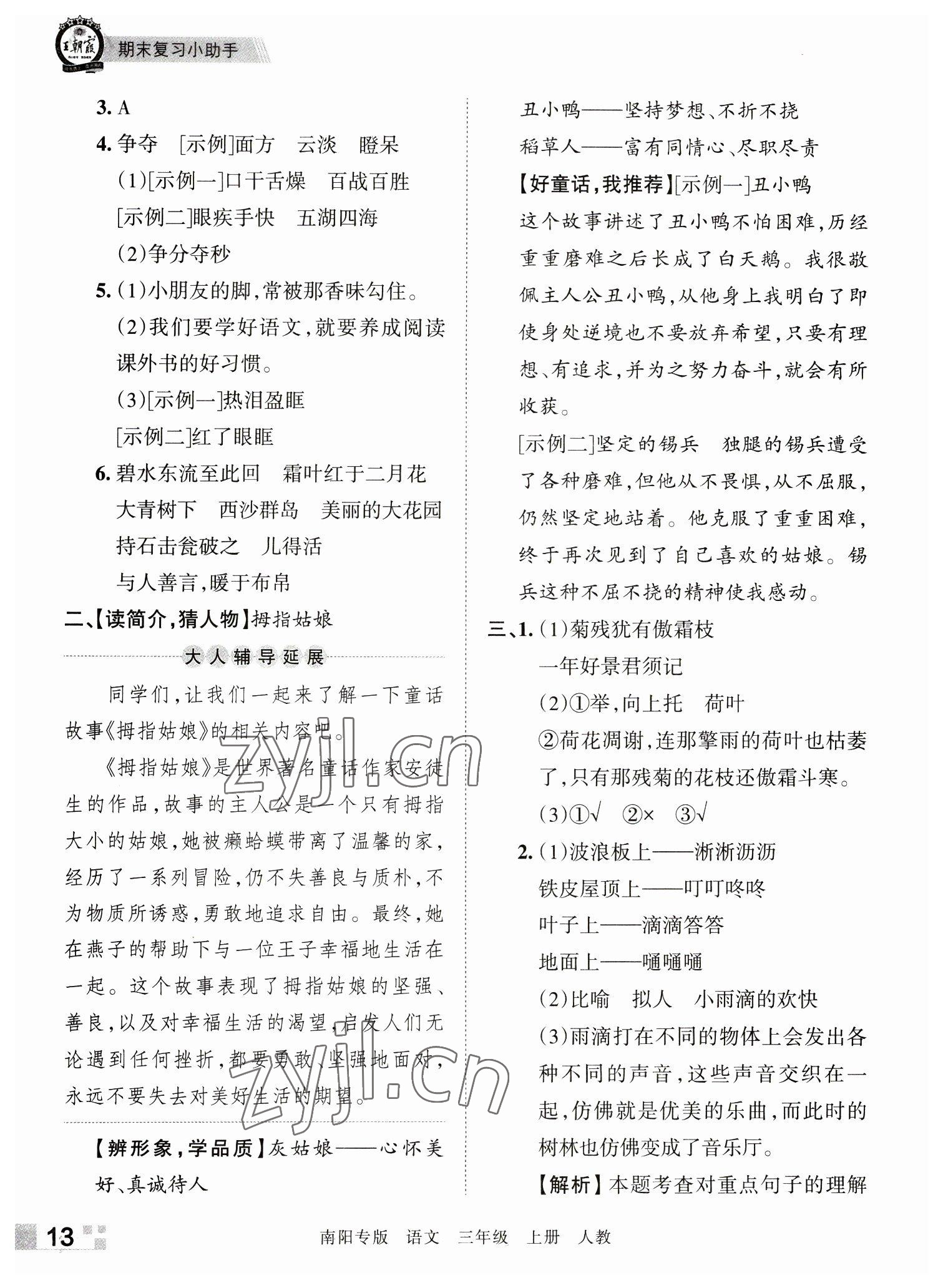注:目前有些书本章节名称可能整理的还不是很完善,但都是按照顺序排列的,请同学们按照顺序仔细查找。练习册 2022年王朝霞期末真题精编三年级语文上册人教版南阳专版 答案主要是用来给同学们做完题方便对答案用的,请勿直接抄袭。