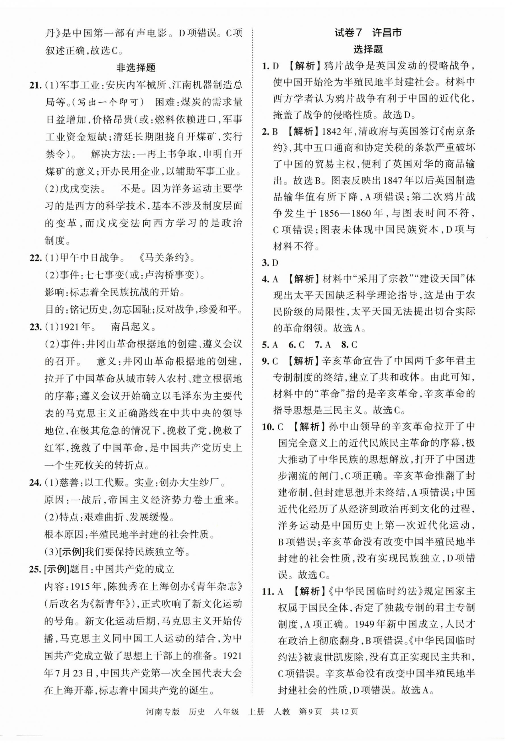 2022年王朝霞各地期末试卷精选八年级历史上册人教版河南专版