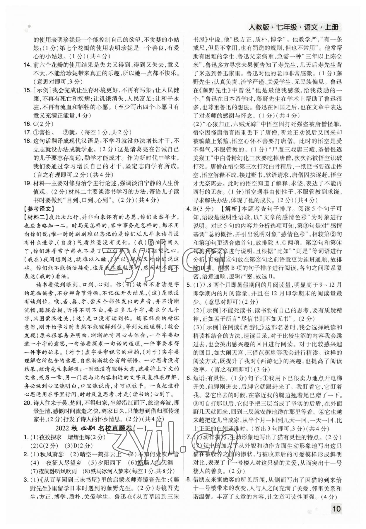 注:目前有些书本章节名称可能整理的还不是很完善,但都是按照顺序排列的,请同学们按照顺序仔细查找。练习册 2022年期末考试必刷卷七年级语文上册人教版郑州专版 答案主要是用来给同学们做完题方便对答案用的,请勿直接抄袭。