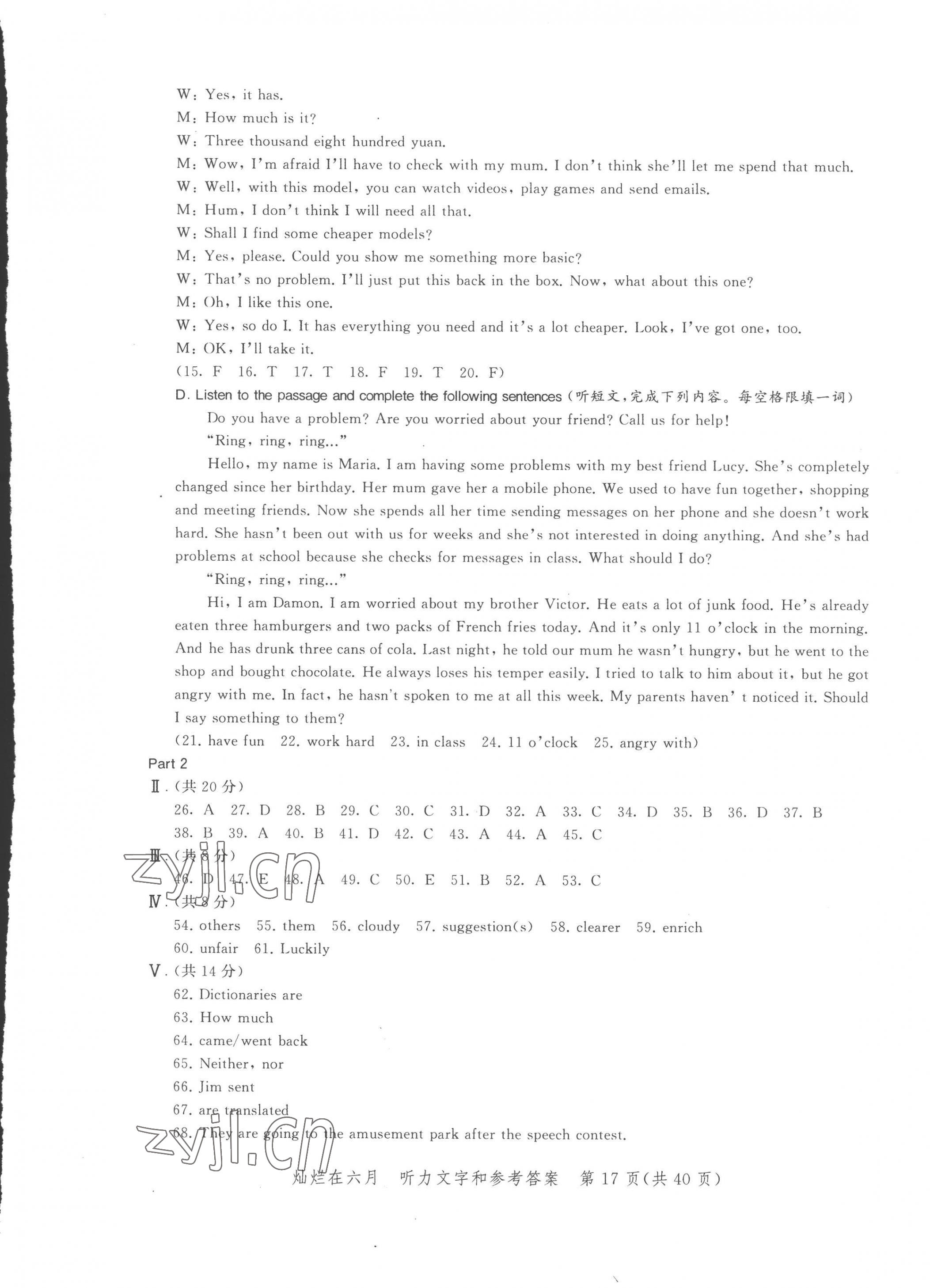 注:目前有些书本章节名称可能整理的还不是很完善,但都是按照顺序排列的,请同学们按照顺序仔细查找。练习册 2023年灿烂在六月上海中考真卷英语 答案主要是用来给同学们做完题方便对答案用的,请勿直接抄袭。