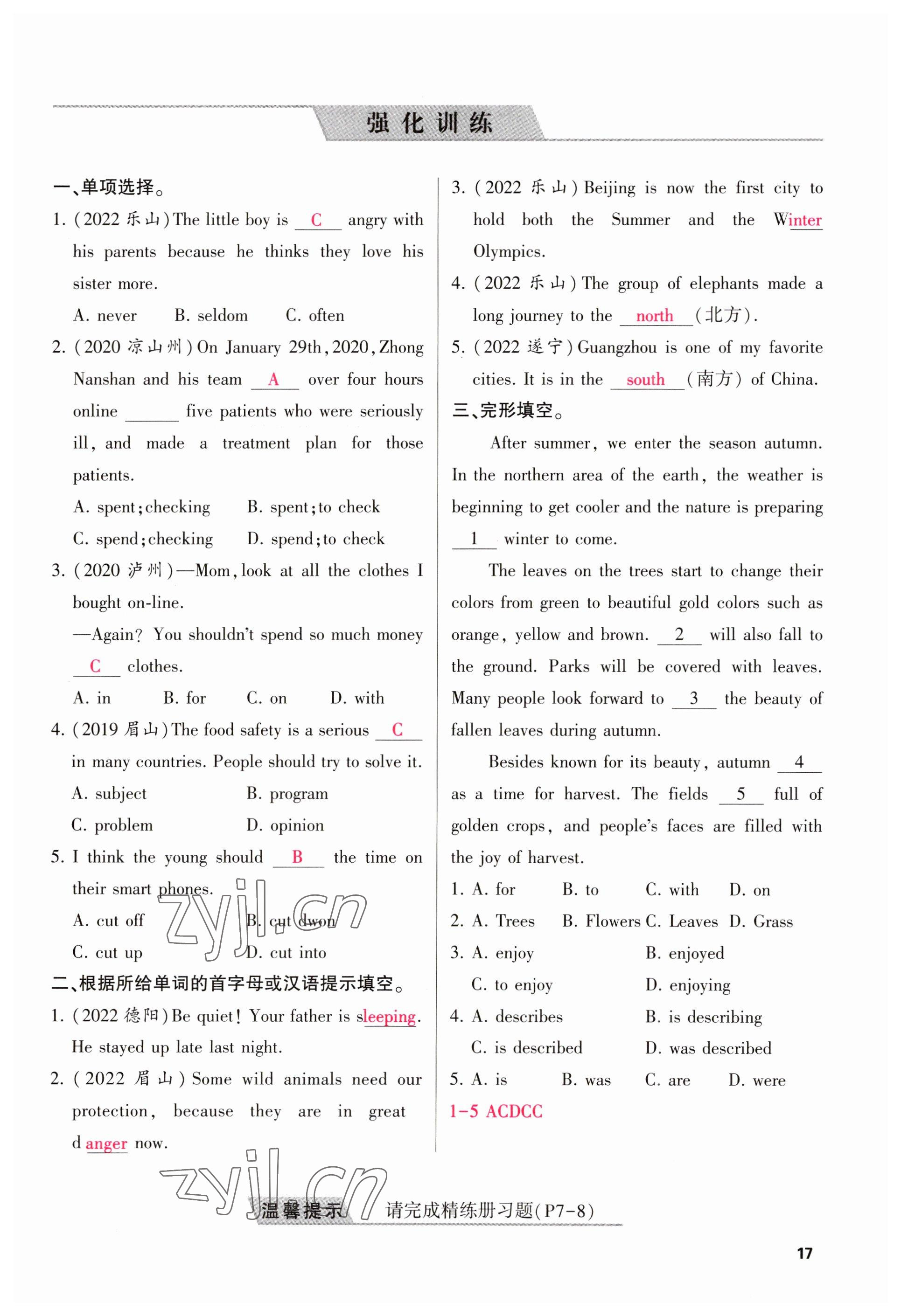 注:目前有些书本章节名称可能整理的还不是很完善,但都是按照顺序排列的,请同学们按照顺序仔细查找。练习册 2023年聚焦中考英语四川专版 答案主要是用来给同学们做完题方便对答案用的,请勿直接抄袭。