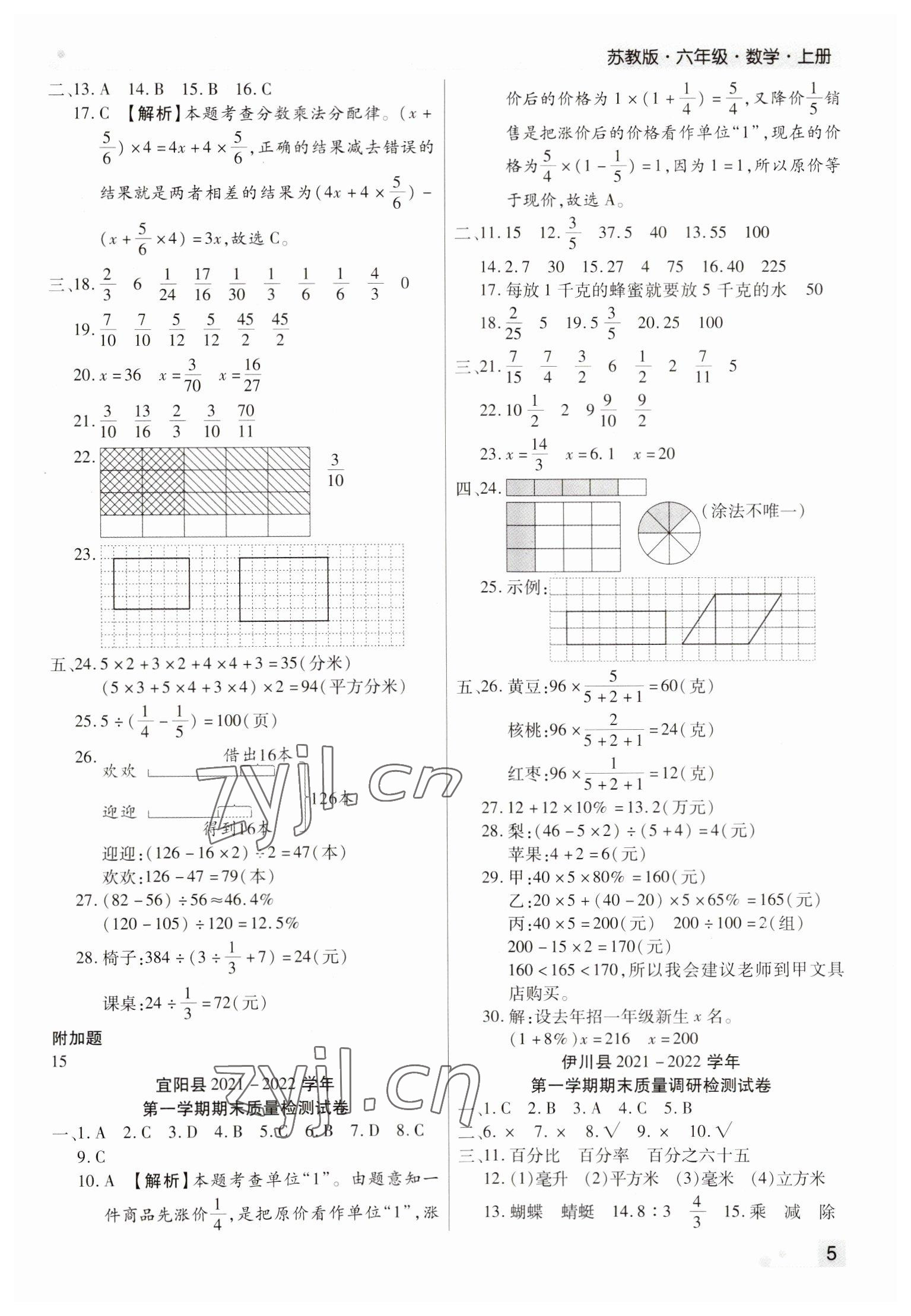 注:目前有些书本章节名称可能整理的还不是很完善,但都是按照顺序排列的,请同学们按照顺序仔细查找。练习册 2022年期末考试必刷卷六年级数学上册苏教版九县七区 答案主要是用来给同学们做完题方便对答案用的,请勿直接抄袭。