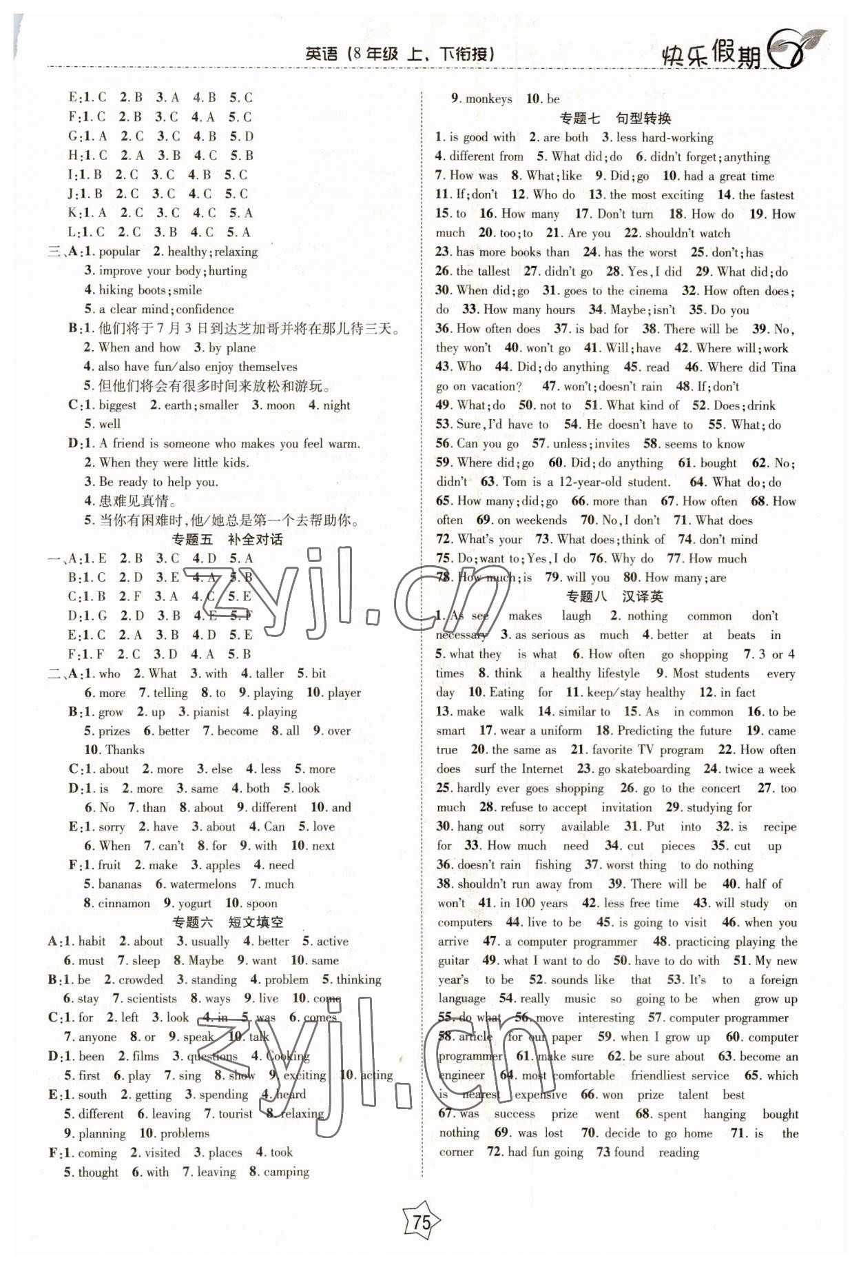 注:目前有些书本章节名称可能整理的还不是很完善,但都是按照顺序排列的,请同学们按照顺序仔细查找。练习册 2023年快乐假期衔接优化训练八年级英语 答案主要是用来给同学们做完题方便对答案用的,请勿直接抄袭。