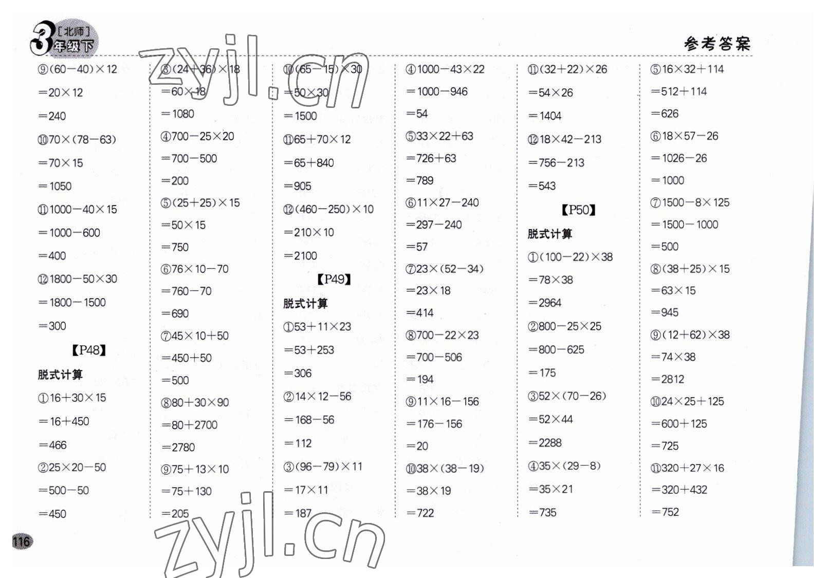 2023年同步口算题卡三年级数学下册北师大版深圳专版