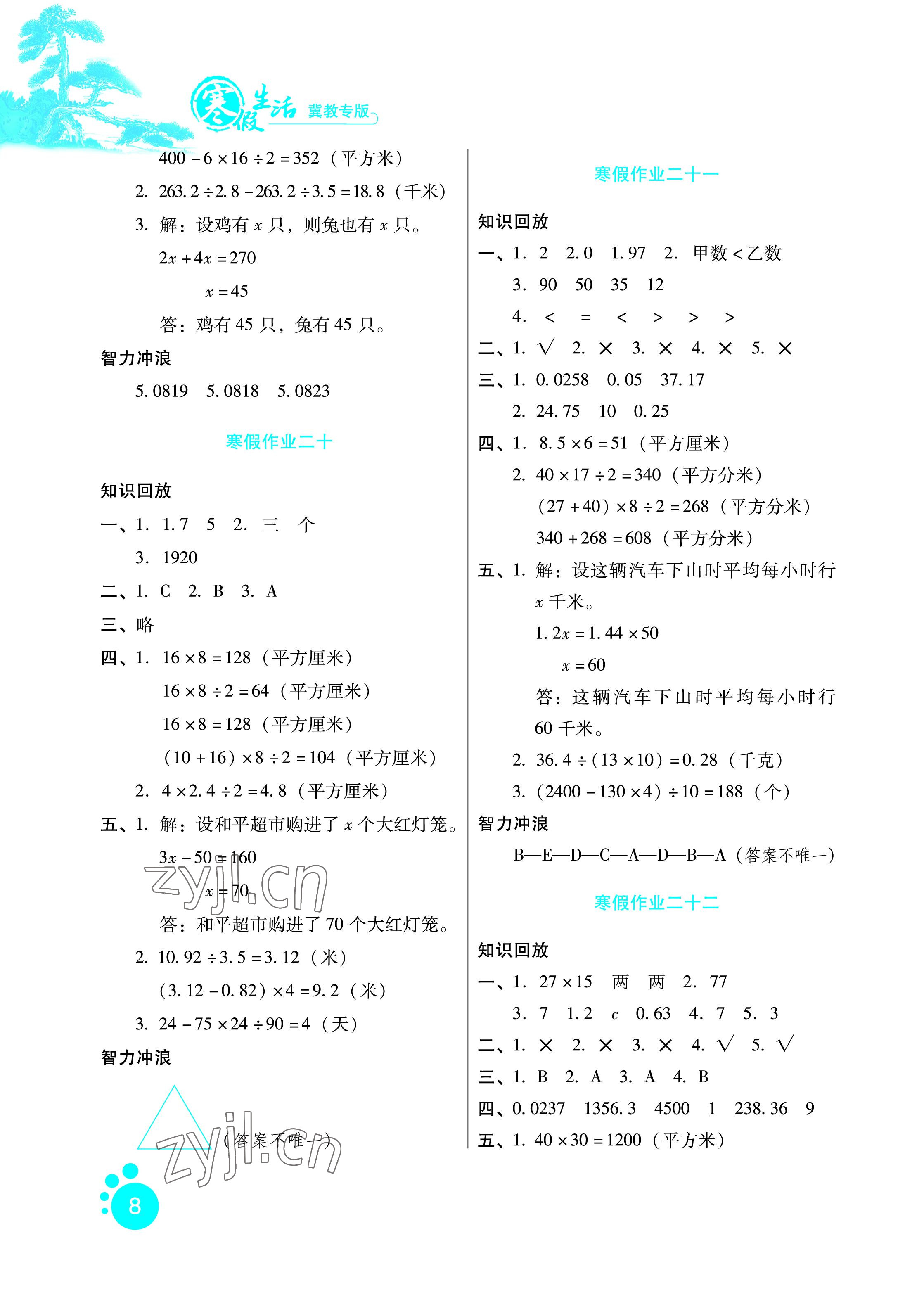 2023年寒假生活五年级数学冀教版河北人民出版社