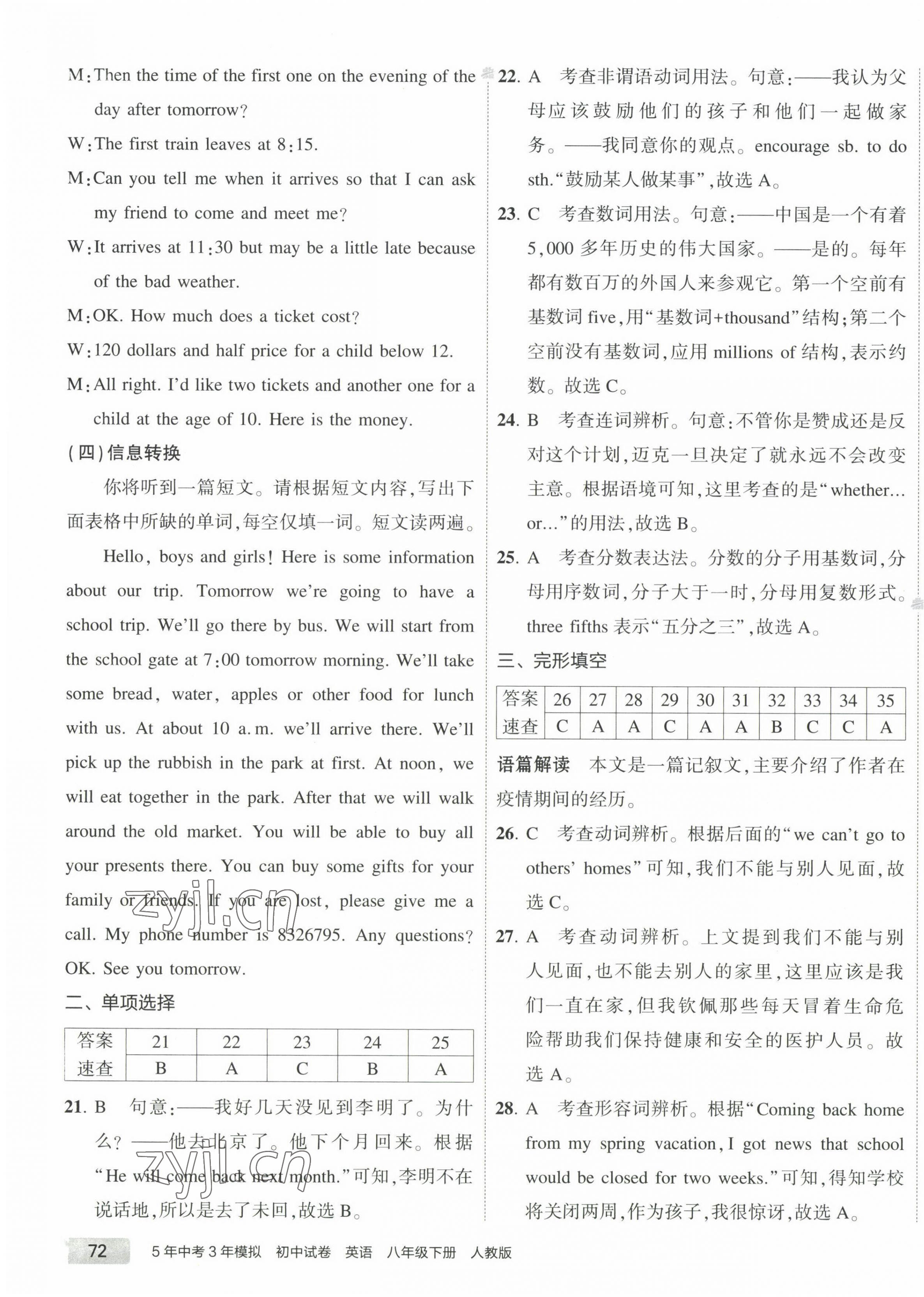 2023年5年中考3年模拟初中试卷八年级英语下册人教版